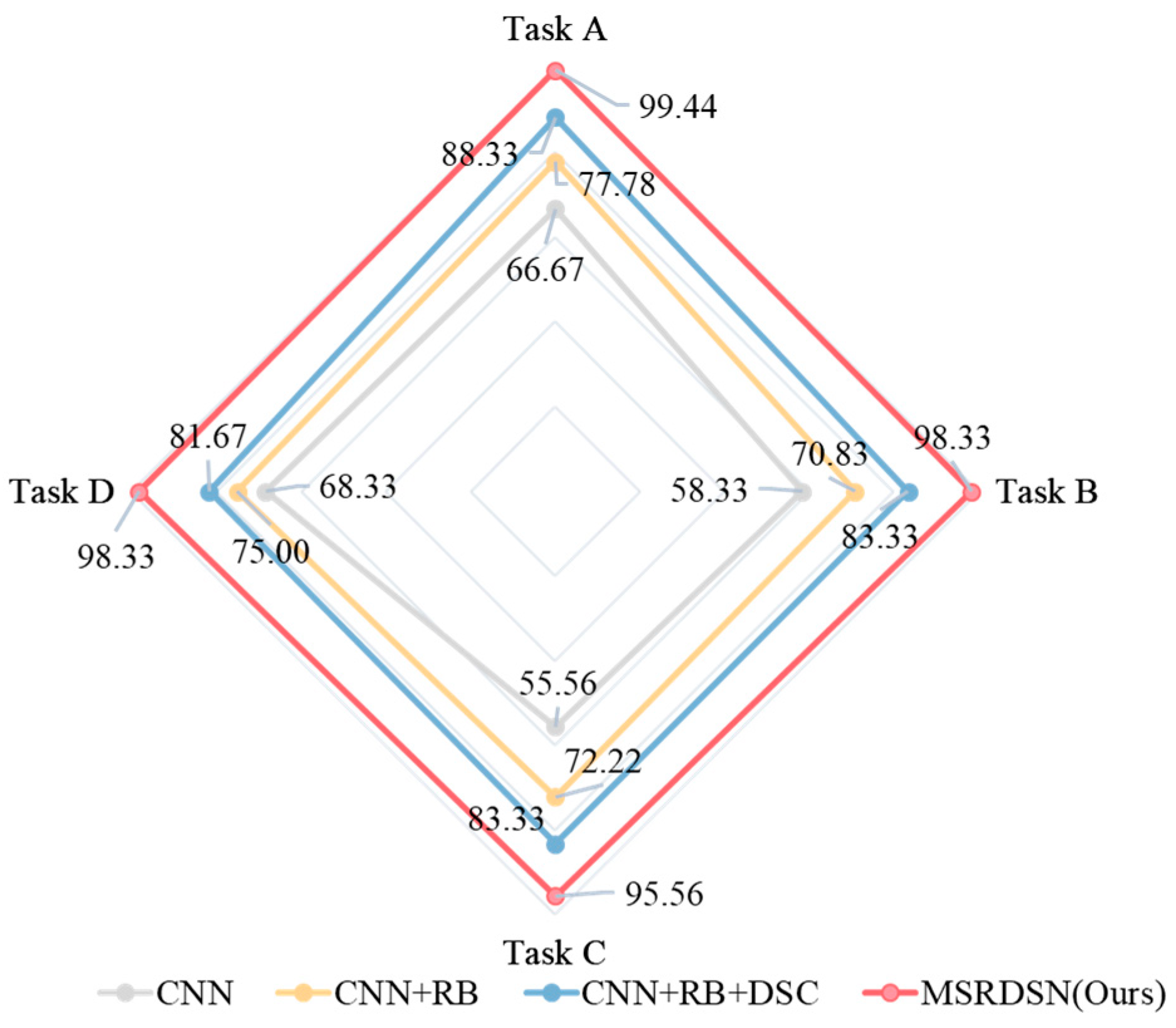 | MSRDSN(Ours) | 99.44 (↑1.11) | 98.33 (↑0.83) | 95.56 (↑1.12) | 98.33 (↑1.66) |