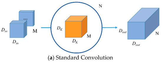 where the number of convolution kernels is generally greater than 1, the convolution kernel size is usually , , . In this article, we choose a convolution kernel size of , and the value of Equation (6) can be calculated to be less than 1. It can be seen that the DSC is less computationally intensive than the standard convolution.