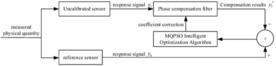 Measure the same physical quantity using a reference sensor and an uncalibrated sensor to obtain their respective response signals and . Apply phase compensation filtering to the response signal obtained from the uncalibrated sensor to obtain the compensated signal . Compare the compensated signal with the response signal from the reference sensor. Use the MQPSO intelligent optimization algorithm to correct the filter coefficients, thereby aligning the phase response of the uncalibrated sensor with that of the reference sensor.