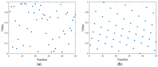 In this case, is the remainder function, and is the value of the th mapping. Assuming there are 50 particles, the initial population generated by the Circle chaotic mapping shown in Figure 4b is more uniformly distributed compared to the traditional initial population method shown in Figure 4a. This feature enables it to retain more information and enhance particle diversity, thus providing a solid foundation for the subsequent optimization operations of the algorithm.