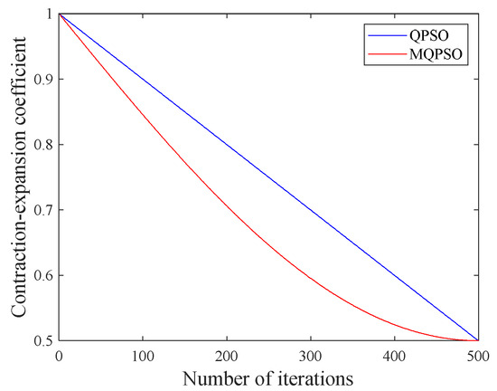 Among them, and are random numbers between 0 and 1, represents the local optimal position of the particle swarm, represents the global optimal value of the particle swarm, is the contraction/expansion coefficient, and represents the average value of the global extrema of all particles. The expressions for the contraction/expansion coefficient and the average value of the average optimal position [24] are shown in Equations (5) and (6).