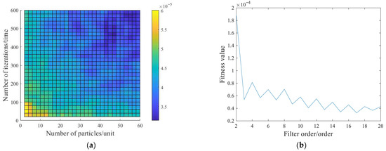 Fitness values of different particle-swarm parameters. (a) Fitness values for different numbers of iterations and different particle-swarm sizes. (b) Fitness values for different filter orders.
