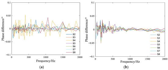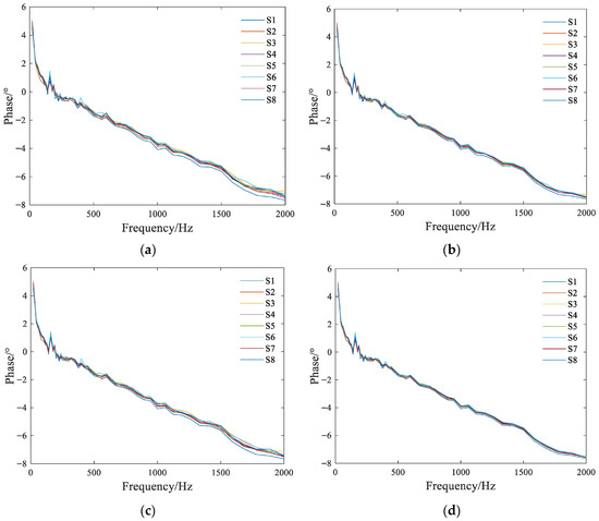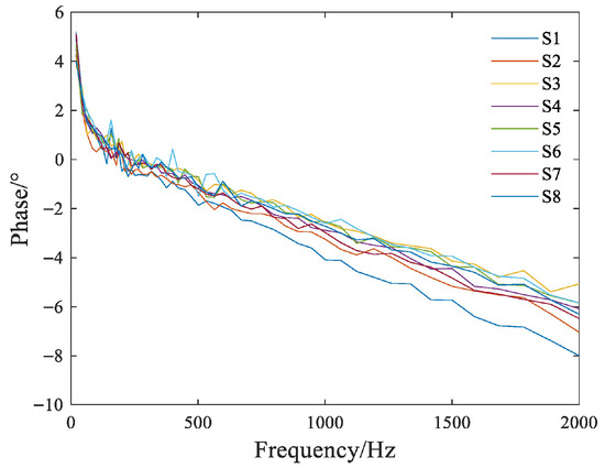 The excitation signal of the vibration table was set as a sine signal with a frequency range from 20 Hz to 2000 Hz, and the driving acceleration is set to 9.807 m/s2. Phase calibration was carried out on the same axial direction of eight sensors, S1~S8, respectively. The original phase–frequency characteristics of the sensors are obtained as shown in Figure 8.