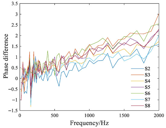 All sensors exhibit a phenomenon of low-frequency positive phase and high-frequency negative phase. Using sensor 1 as a reference, the relative phase differences in each sensor are obtained in Figure 9.