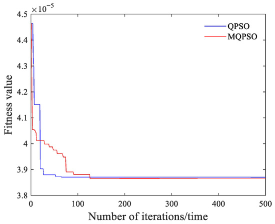 The number of iterations for both the QPSO and MQPSO algorithms is set to 500, the number of particles is set to 50, and the order of the phase compensation filter is set to 17, which means the dimension of the particles is 17. The optimization models based on the QPSO and MQPSO algorithms are run on the MATLAB R2021a platform. After the iteration is completed, taking Sensor 2 as an example, the fitness curve is shown in Figure 10.