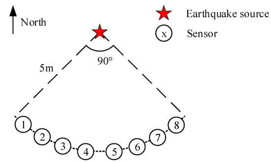 We designed a field experiment to verify the effectiveness of the phase compensation module of MQPSO in the detection hardware system. First, acceleration sensors were used to acquire vibration signals. Then, the collection and phase compensation of these vibration signals were completed on the Data Acquisition device. Finally, the vibration signals were transmitted to the PC side, where they were analyzed using the MATLAB simulation platform. The detailed performance information of the detection hardware system is shown in Table 3. The layout is shown in Figure 13. Among them, numbers 1~4 are equipped with the MQPSO phase compensation module, while numbers 5~8, serving as the control group, are not. All sensors are located 5 m from the epicenter. Arranged according to the schematic diagram, the X-axis points toward the source, the Y-axis is perpendicular to the X-axis and points east, and the Z-axis is perpendicular to the ground plane and points upward. A3 kg TNT charge was used as the source, buried at a depth of 1.5 m. The sensors were buried below the ground surface and covered with soil, as shown in Figure 14.