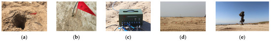 Photographs of the experimental site. (a) Bombing point pit; (b) sensor; (c) the Data Acquisition device; (d) Installation site; (e) detonation.