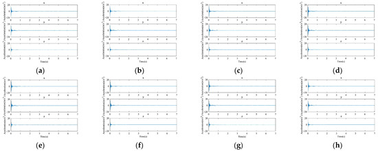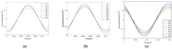 Comparing the amplitude-frequency curves of the eight sensors, as shown in Figure 18. From the frequency domain comparison, it can be seen that the signals collected by the eight sensors are within the same frequency band, mainly concentrated within 200 Hz, with the dominant frequencies of the signals on each axis being 85, 90, and 48 Hz, respectively. The time domain waveforms corresponding to the dominant frequencies of the signals collected by each sensor are extracted, as shown in Figure 19. At this time, the phase values of each axis of the signals collected by the eight sensors are shown in Table 5. Based on the phase values in the table, calculate the phase differences in each axis of sensors S1~S4 equipped with the MQPSO phase compensation module and those of sensors S5~S8 without the module. As shown in Table 6 and Table 7.