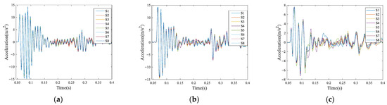 Time domain diagram of multiple sensor overlays. (a) X-axis; (b) Y-axis; (c) Z-axis.