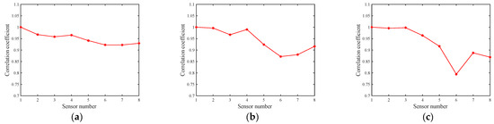 Cross-correlation coefficients between each sensor and sensor 1. (a) X-axis; (b) Y-axis; (c) Z-axis.