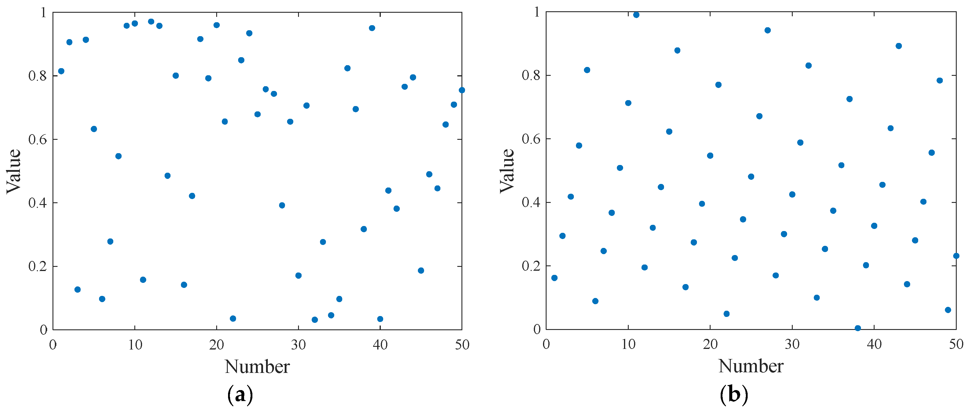 th mapping. Assuming there are 50 particles, the initial population generated by the Circle chaotic mapping shown in