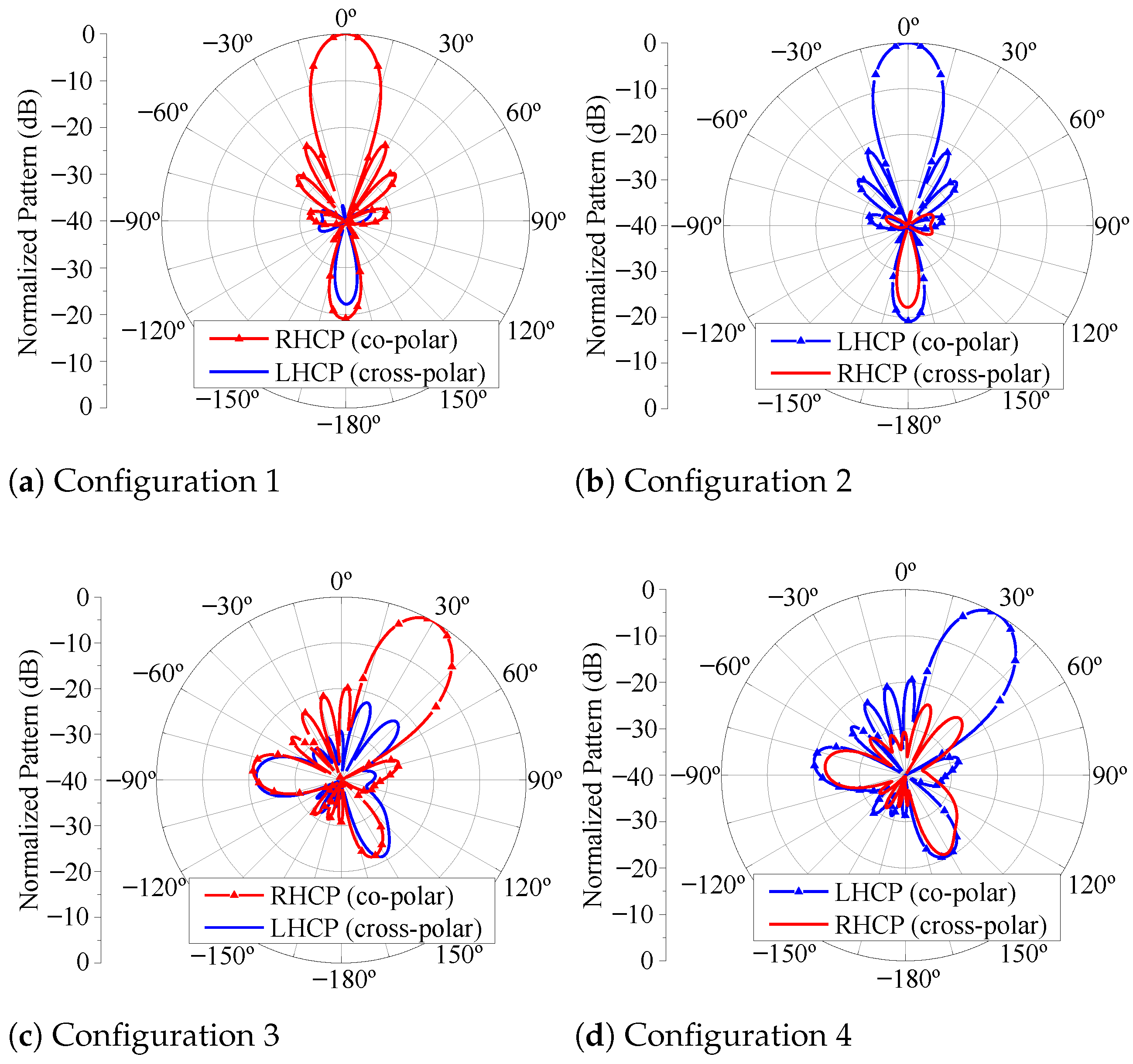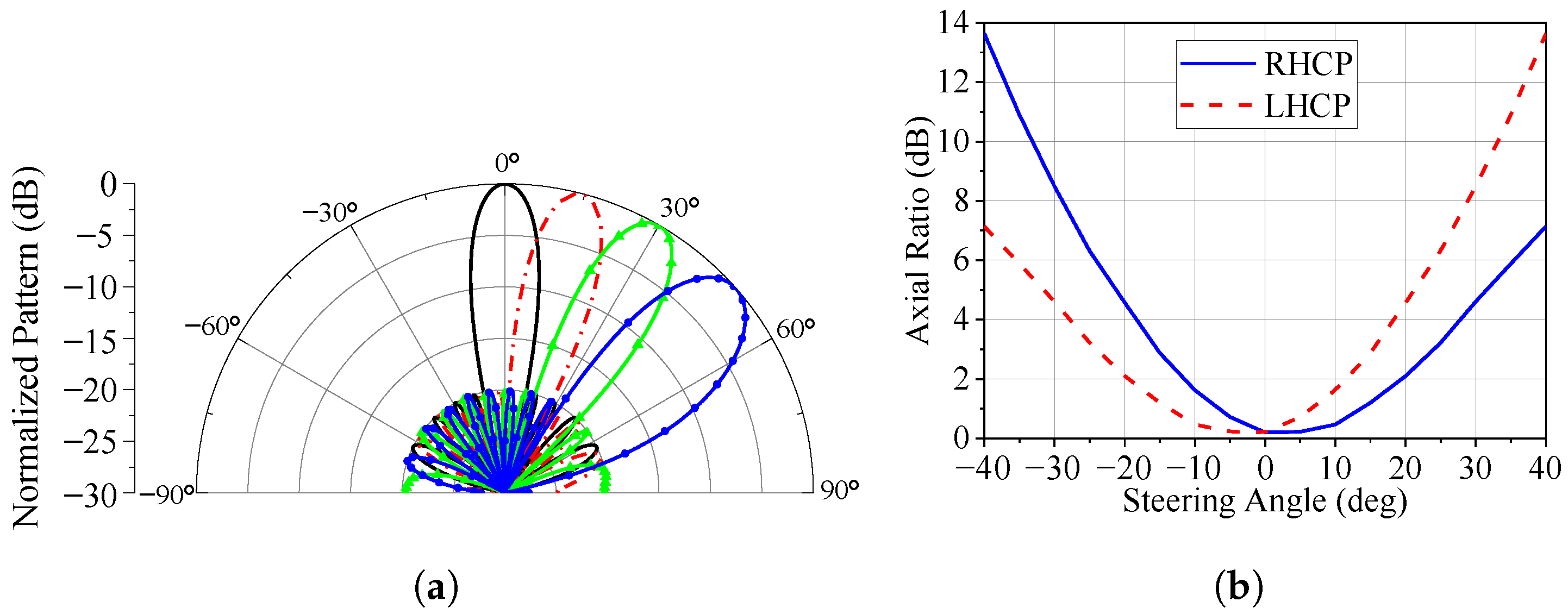 60] achieve a circularly polarized (CP) steered main beam with an axial ratio (AR) better than 3 dB through multiport antennas. In contrast, Ref. [