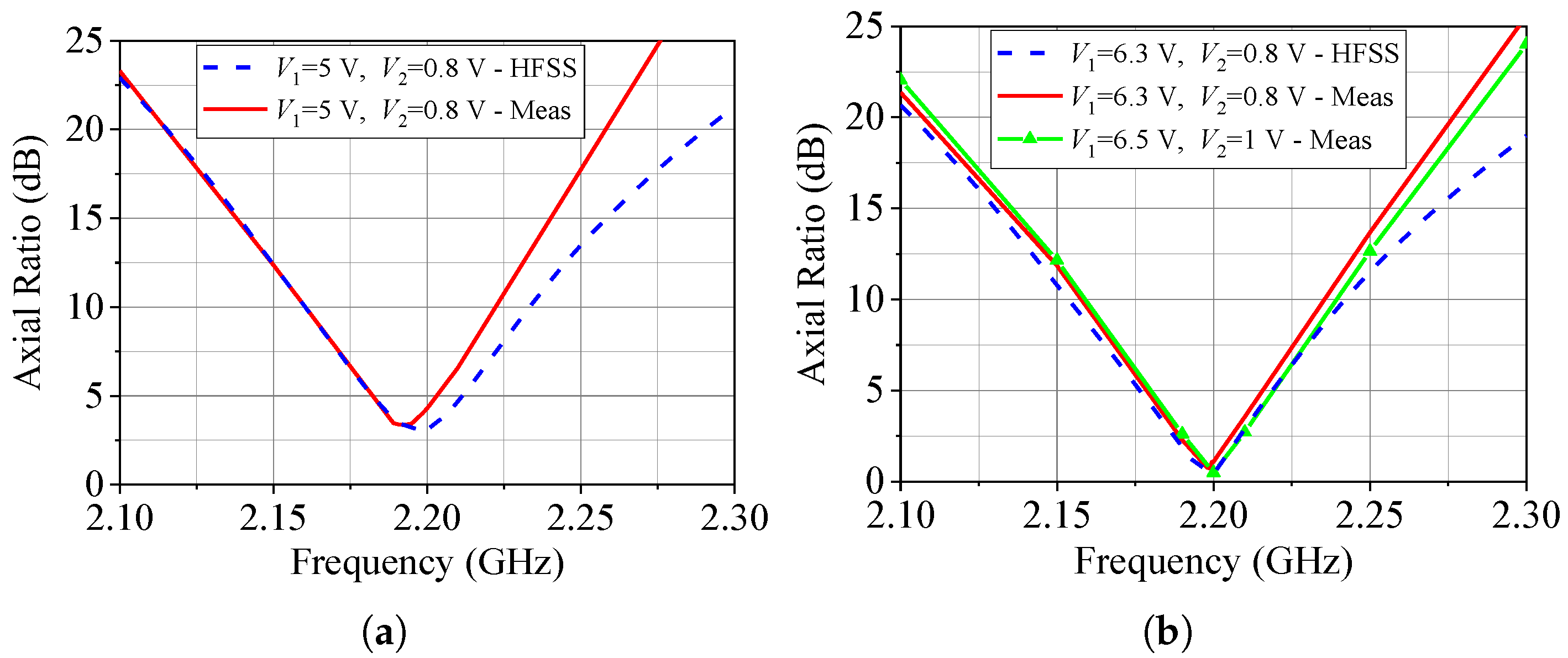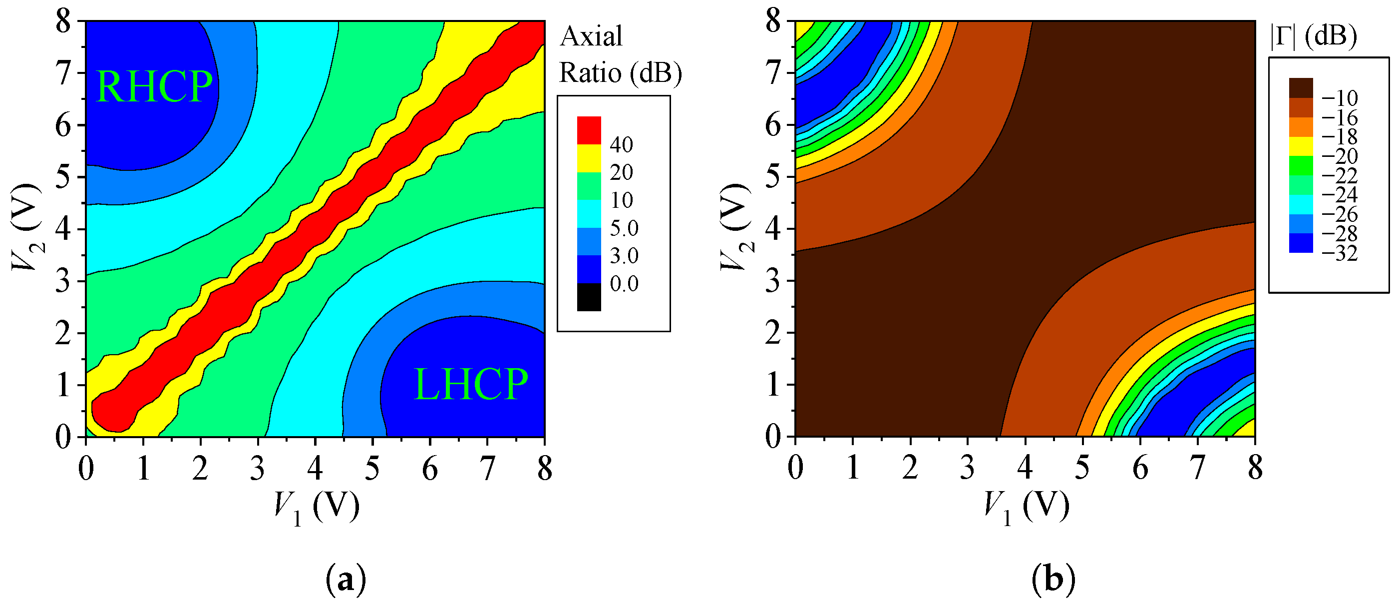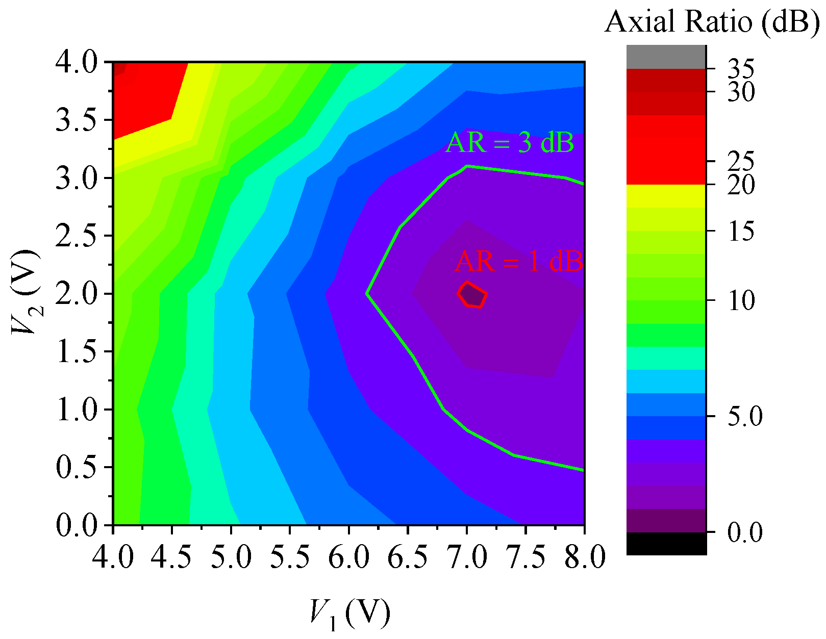) lead to an axial ratio at broadside exceeding 40 dB, indicating the microstrip antenna’s linear polarization. Subsequent analyses are necessary to identify the voltages that guarantee proper impedance matching in this new state.