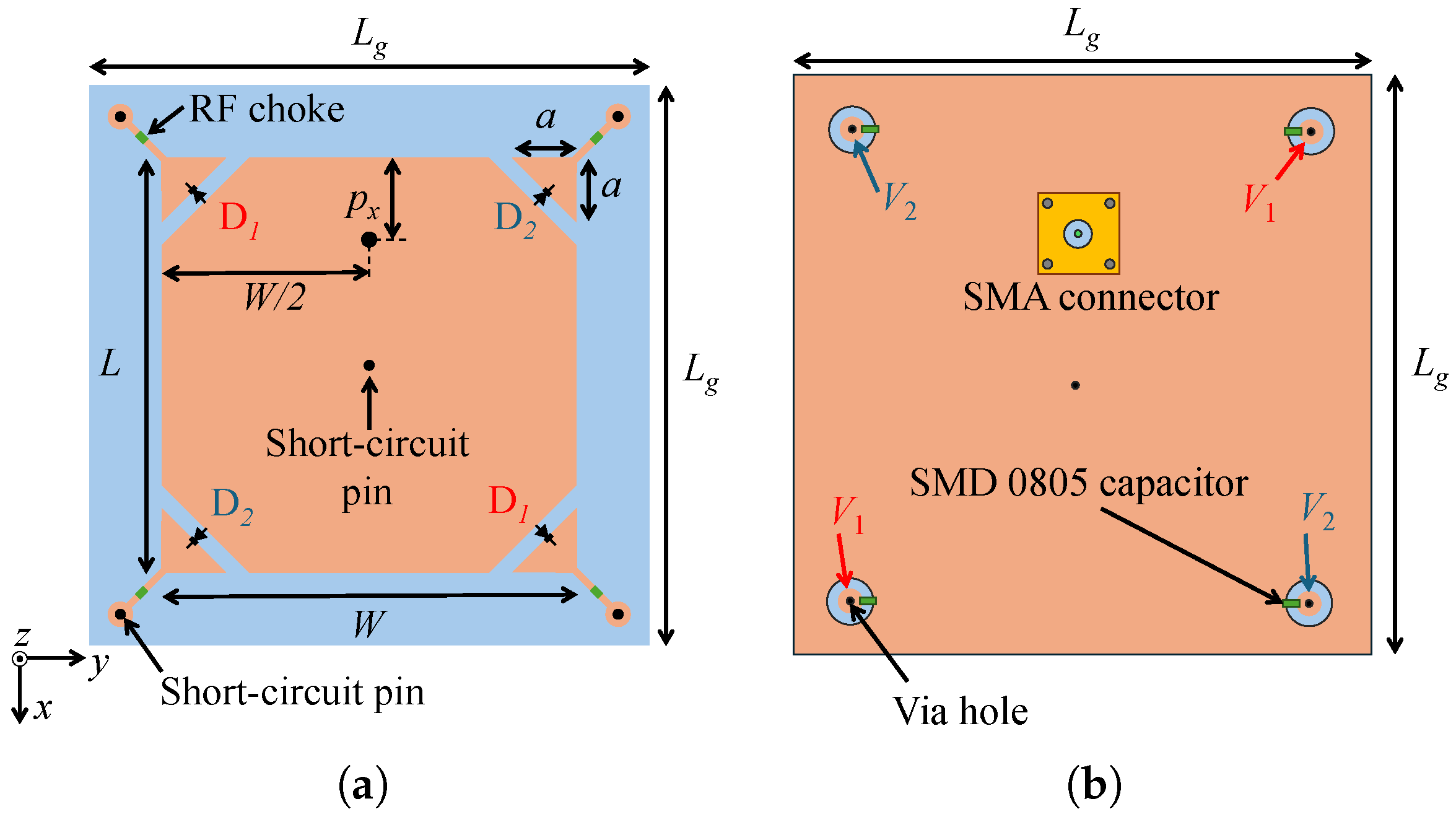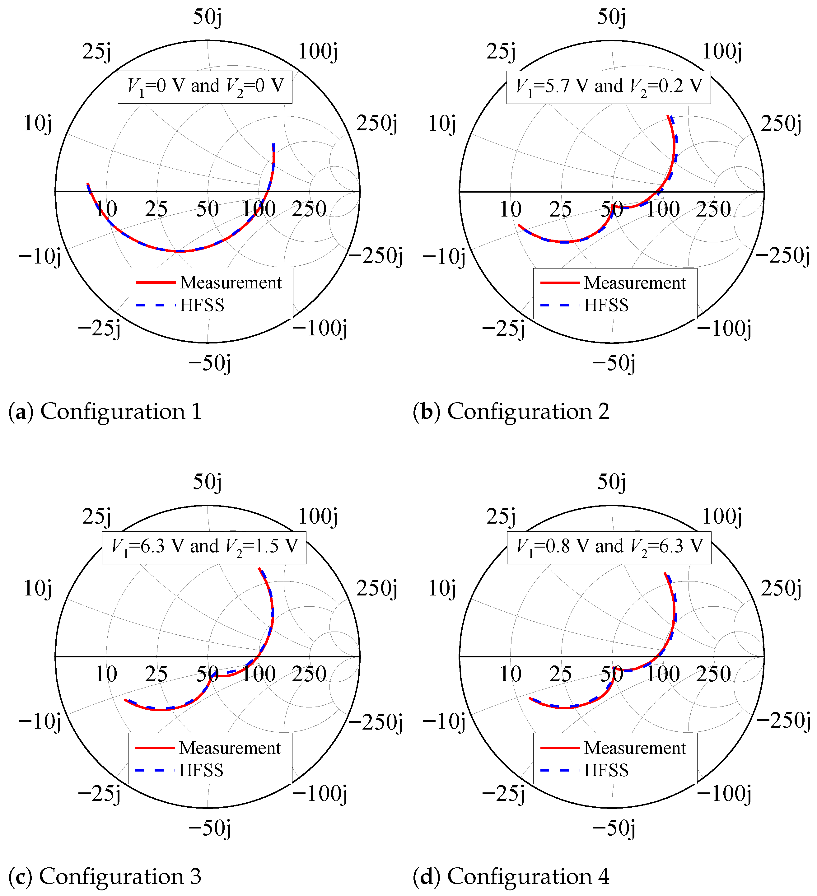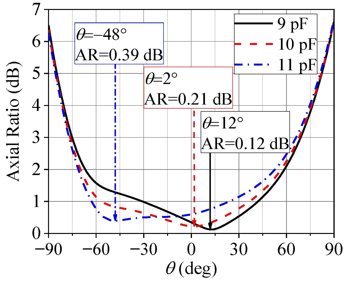 ) lead to an axial ratio at broadside exceeding 40 dB, indicating the microstrip antenna’s linear polarization. Subsequent analyses are necessary to identify the voltages that guarantee proper impedance matching in this new state.