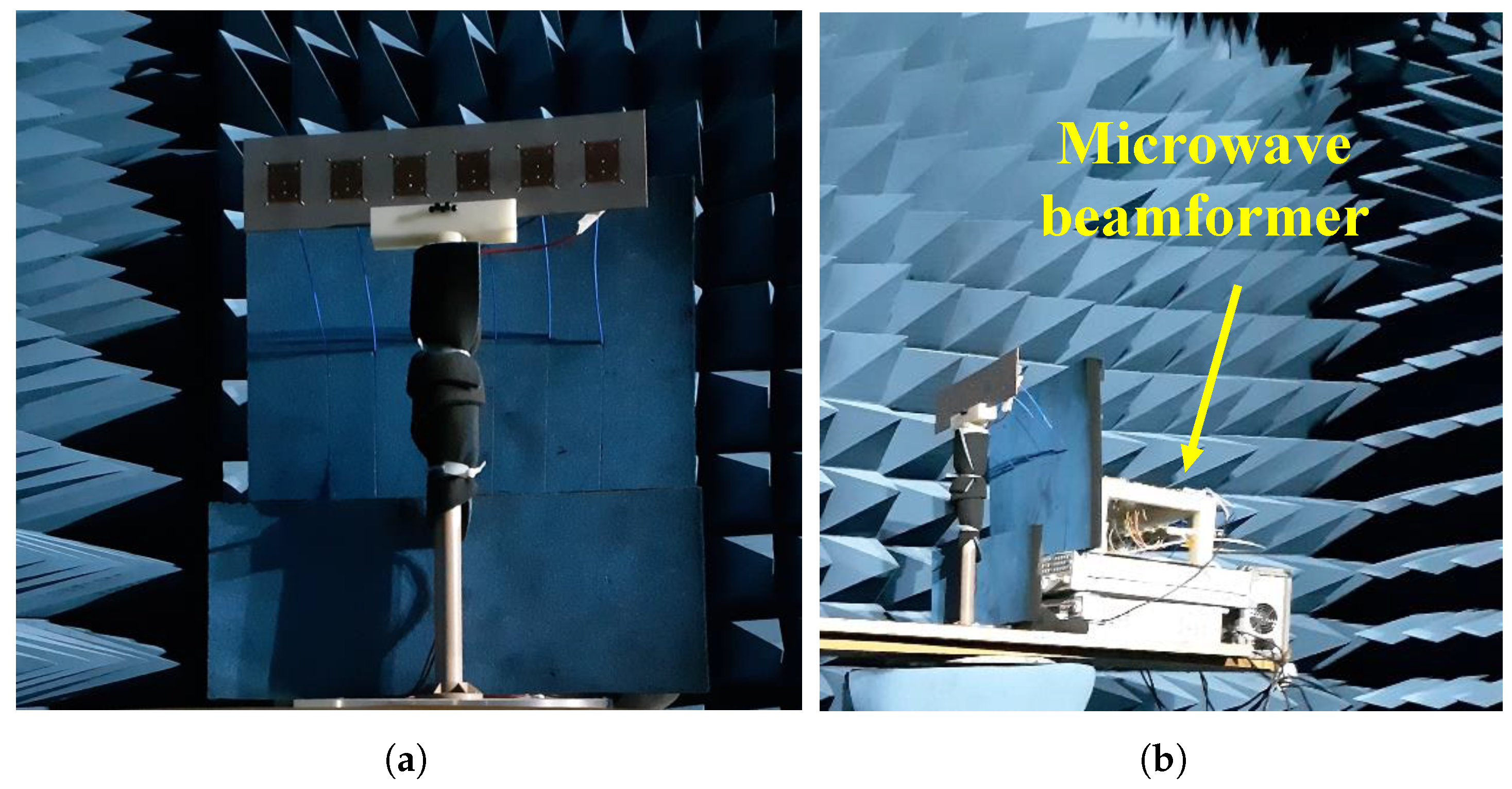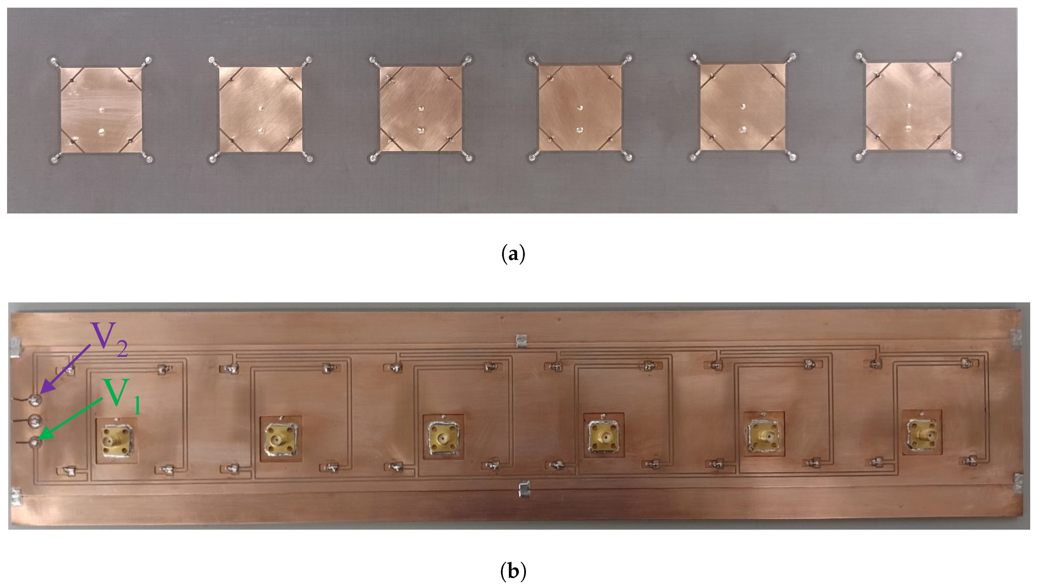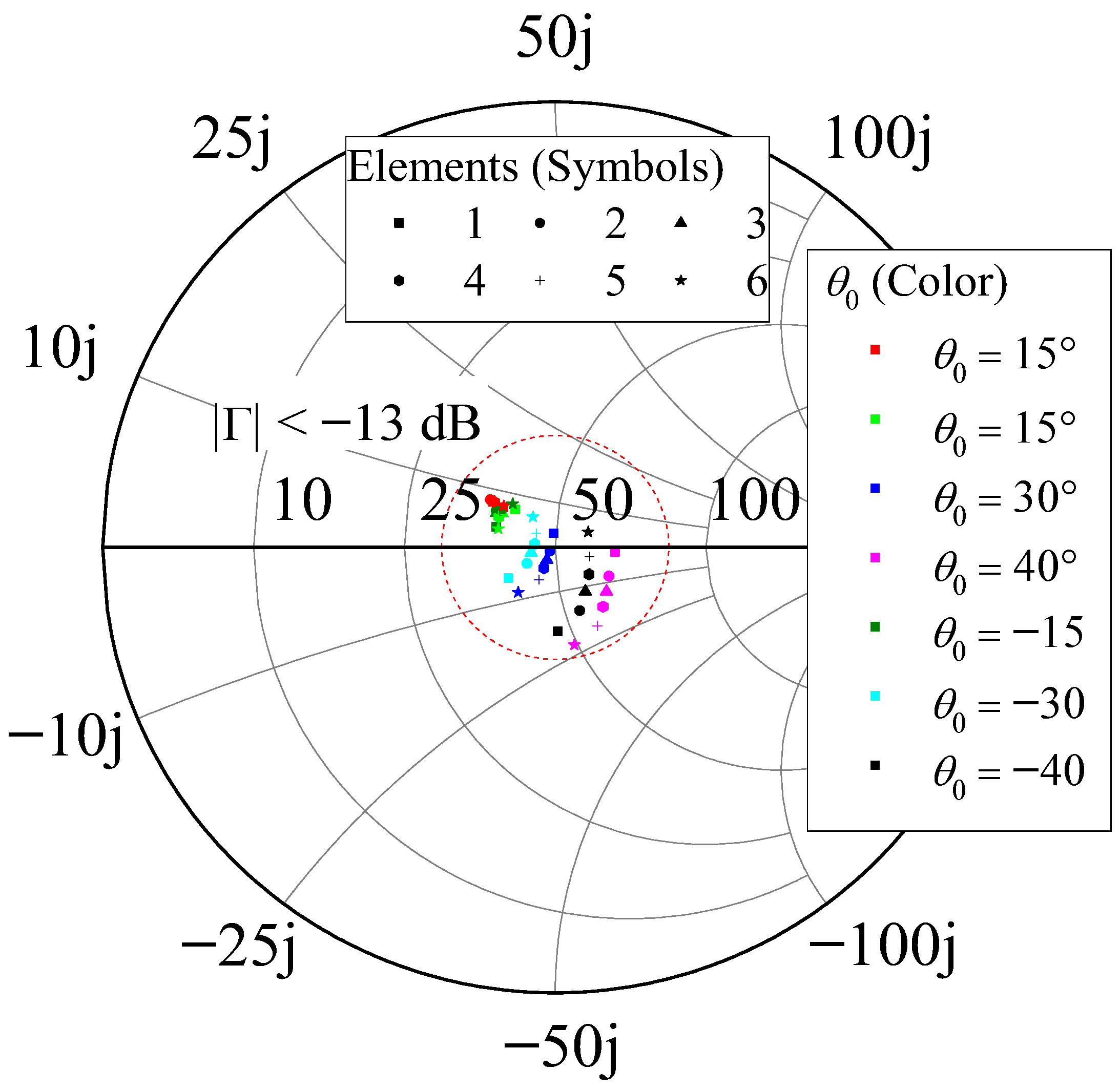 Section 3.1, we proceed with the design and optimization of a six-element linear array that exhibits a low reflection coefficient and a low AR for a wide range of steering angles, as well as for multibeam patterns. The array is then integrated with a microwave beamformer [