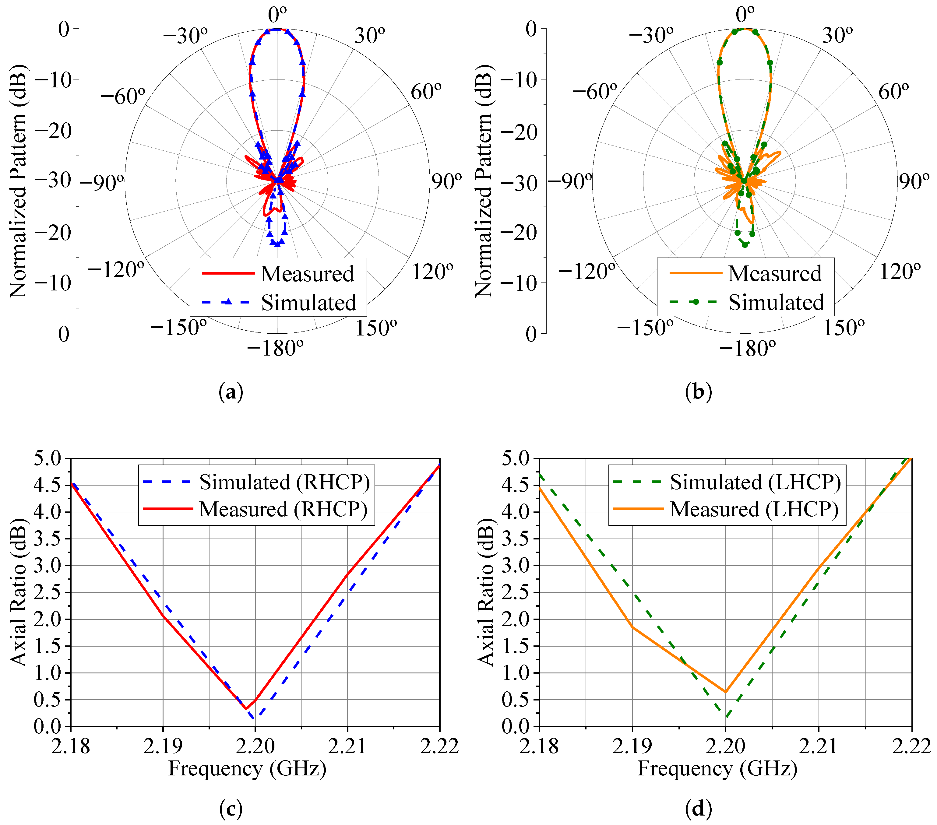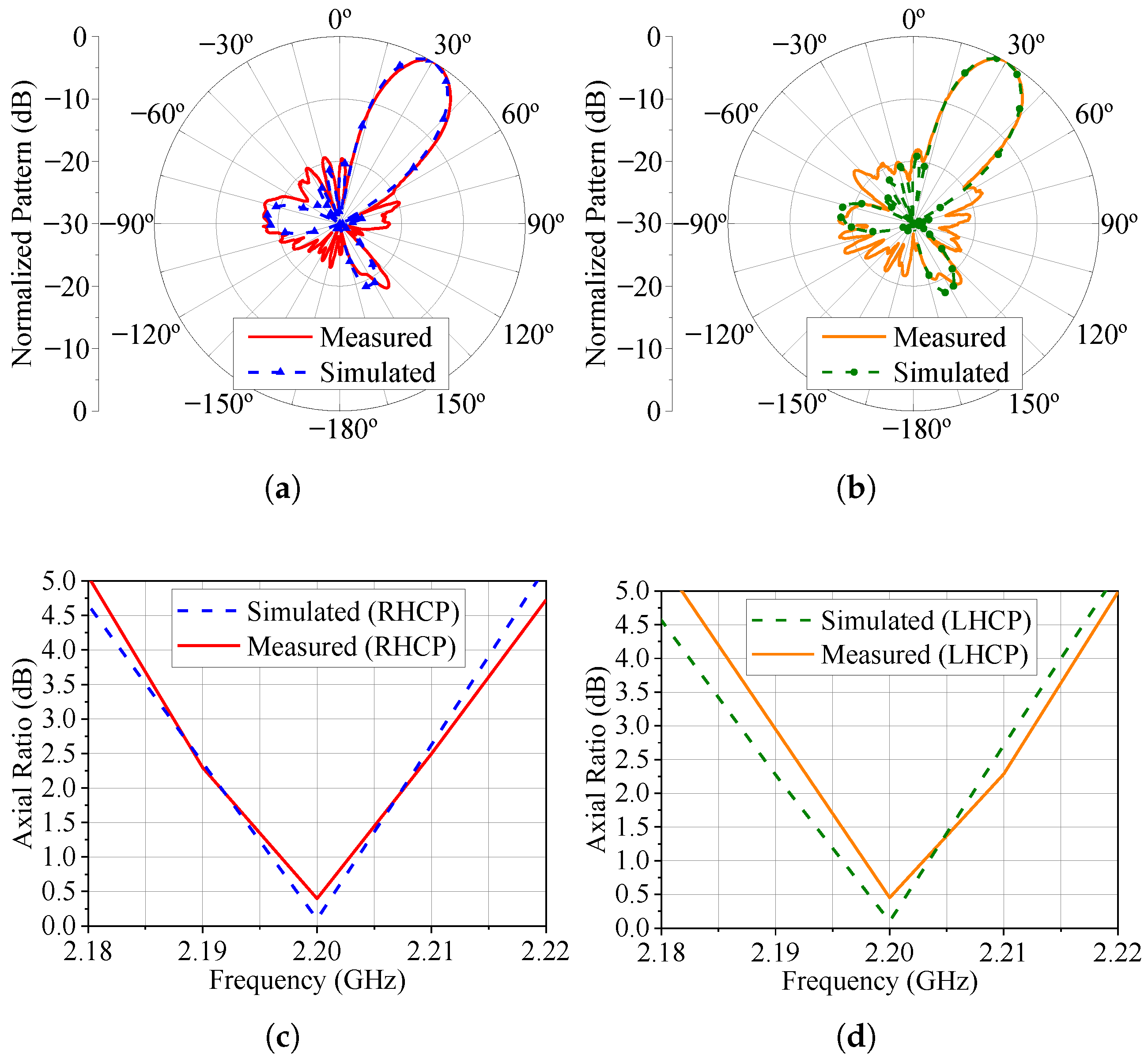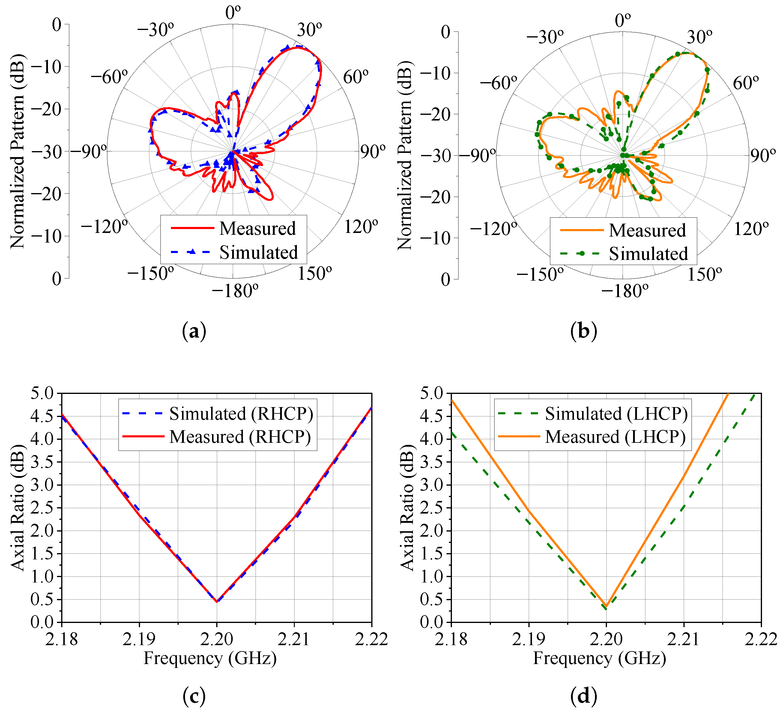 64], and tests are performed in an anechoic chamber to illustrate the capability of steering the main lobe with RHCP or LHCP maintaining excellent levels for the AR, as reported in