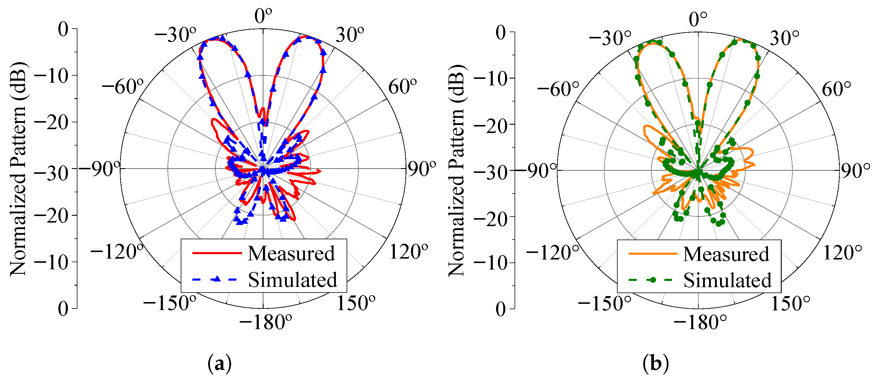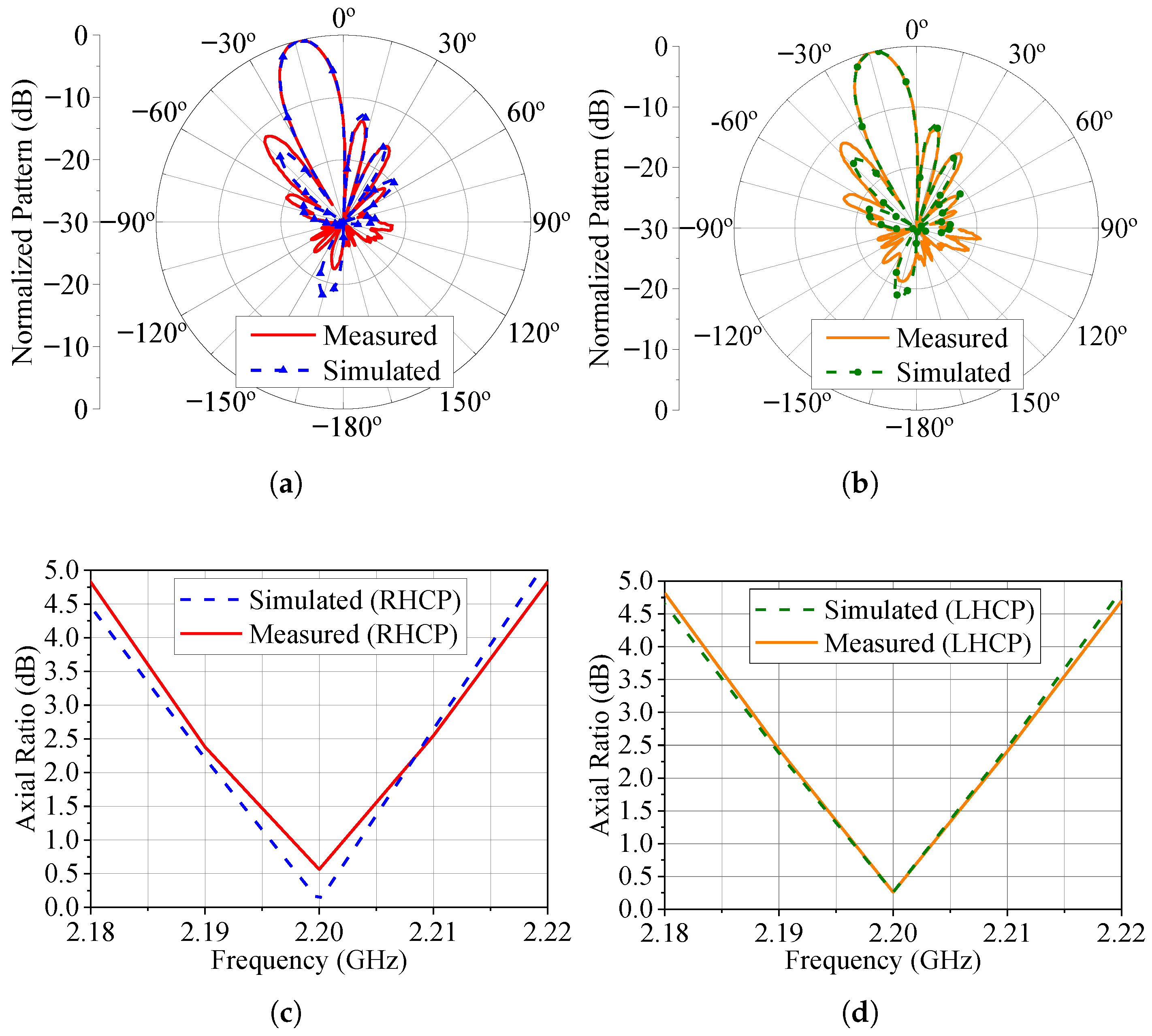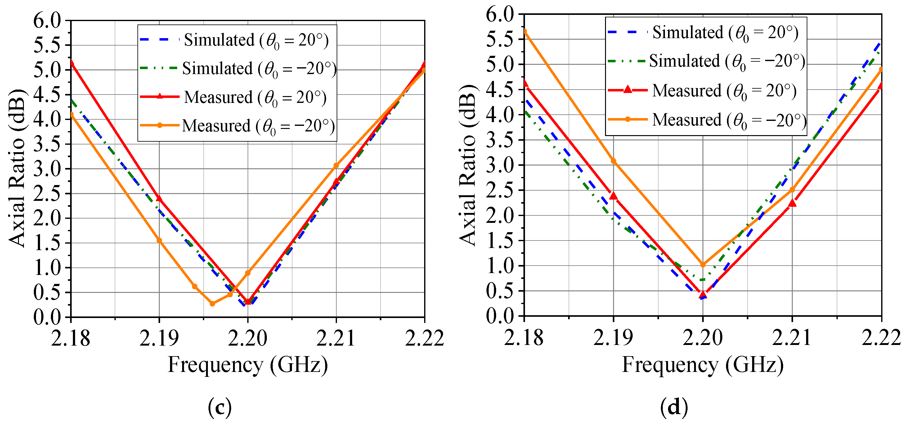 63], but with the p-i-n diodes replaced by varicap diodes. The main idea is to use the continuous variation of the equivalent capacitance of the varicaps to change the sense of polarization and to fine-tune the AR, which cannot be accomplished with p-i-n diodes. Consequently, the AR at the main beam maximum is not degraded and remains close to 0 dB for all pointing angles. In addition to the theoretical procedure for designing the antenna and the array, a comprehensive experimental validation was also conducted. The obtained results demonstrate an excellent agreement between the measured input impedance and radiation pattern of the antenna and the corresponding full-wave simulations. A similar consistency is observed for the phased array, where the synthesized radiation patterns closely match the simulated ones, confirming the axial ratio reconfigurability both for main-beam steering and for the dual-beam configuration.