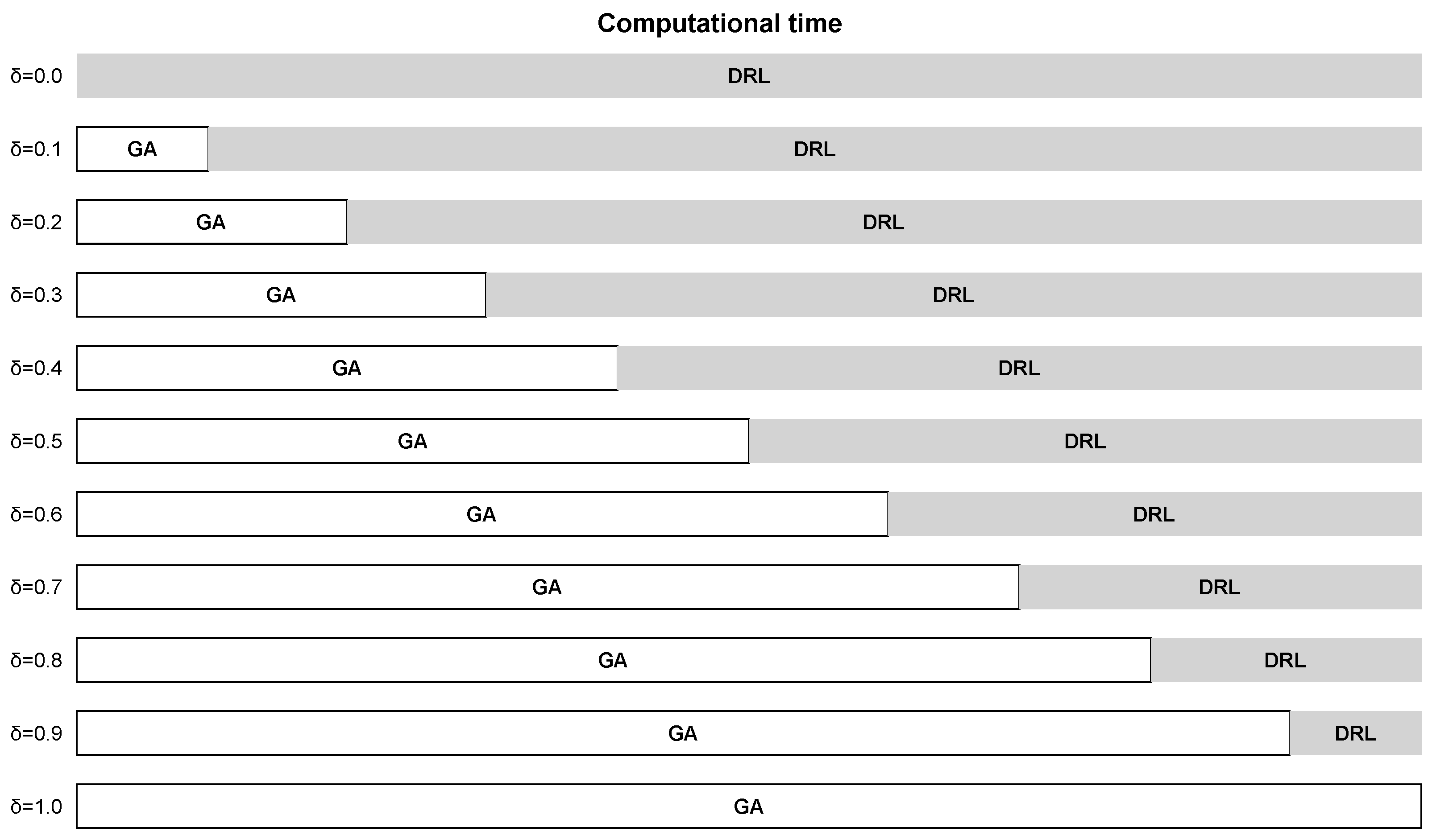- DRL refinement behavior in hybrid runs: For –0.3, DRL successfully refines the GA solution to C.U. (best observed). For –0.9, DRL produces C.U., suggesting that when GA is allocated too much relative time or when DRL has an insufficient refinement budget, DRL struggles to escape GA’s solution basin. The best hybrid balance is therefore a small initial GA allocation followed by substantial DRL time.