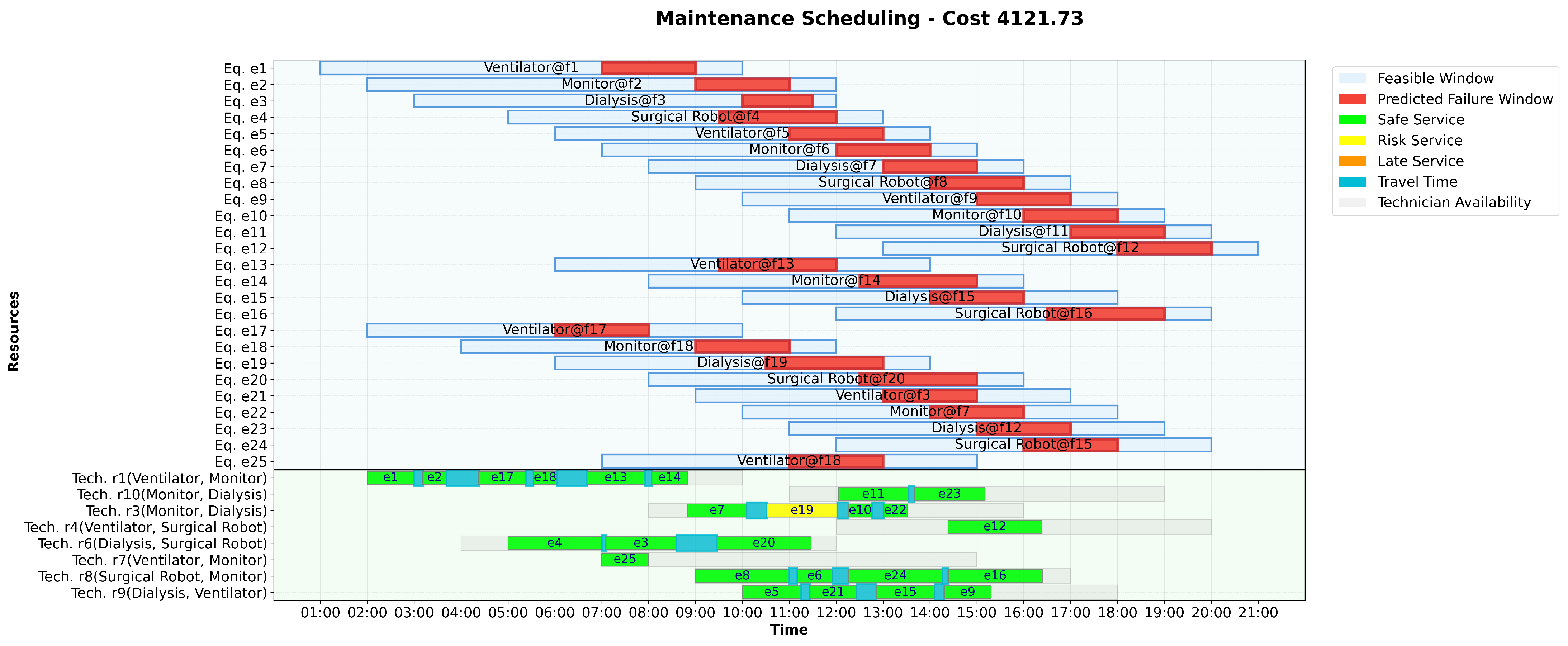 - Domain Integration: Comprehensive modeling of healthcare-specific constraints including multi-modal equipment, specialized skills, critical time windows, and IoT-derived failure predictions.