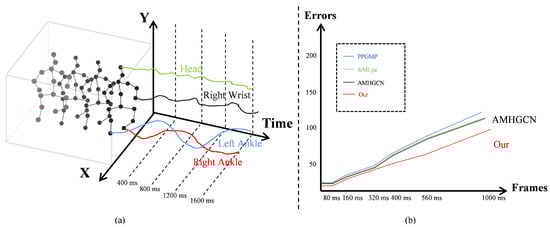 Human motion prediction is a complex spatiotemporal modeling issue that has been a longstanding and challenging research topic in the field of computer vision. Due to its importance in modeling and understanding human behavior, 3D human motion prediction has applications in areas such as animation [1], motion synthesis [2], and human–computer interaction [3,4,5]. Future extensions may enable deployment in more complex environments, including autonomous systems and augmented/virtual reality.