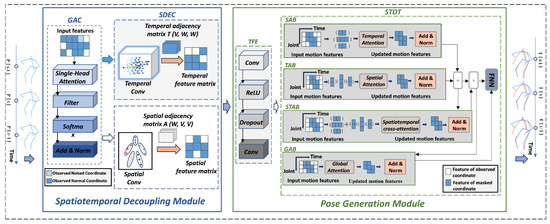 Spatiotemporal Decoupling for Human Motion Prediction. The adjacent joints of a human pose inherently exhibit spatial correlations, whereas joint movement trajectories over time are relatively independent. Previous efforts have attempted to process temporal and spatial features independently [7,15,46,50], achieving promising results. In the first spatiotemporal graph convolutional network (ST-GCN) [46] designed for human action recognition using an encoder–decoder architecture, joints are treated as nodes, the natural topologies (i.e., skeletal connections) between adjacent joints are treated as spatial edges, and the identical node connections across adjacent frames are treated as temporal edges. The generated spatiotemporal graph embedding human action features is then fed into ST-GCN to extract the relevant human action features, spatial dimensions (through spatial GCN layers), and temporal dimensions (through TCN layers). Based on ST-GCN, a new spatiotemporal separable graph convolutional network (STS-GCN) [7] has been proposed to predict human motion, utilizing graph adjacency matrix decomposition to separately extract the temporal and spatial features. These are examples of attempts to decouple spatiotemporal features using GCNs. Previous works have also tried using Transformers for spatiotemporal decoupling. The spatiotemporal Transformer (ST-Trans) [15] and the spatiotemporal deformable transformer adaptive network (STDTA) [50] include the design of two attention modules to decompose the spatial and temporal dependencies, achieving effective modeling. Inspired by previous work, our approach includes designing a spatiotemporal decoupling module and a pose generation module. The spatiotemporal decoupling module employs spatial and temporal convolutions to decouple spatiotemporal features, while the pose generation module designs four attention modules for more accurate human pose modeling.