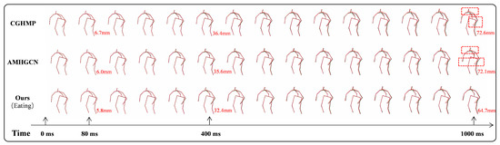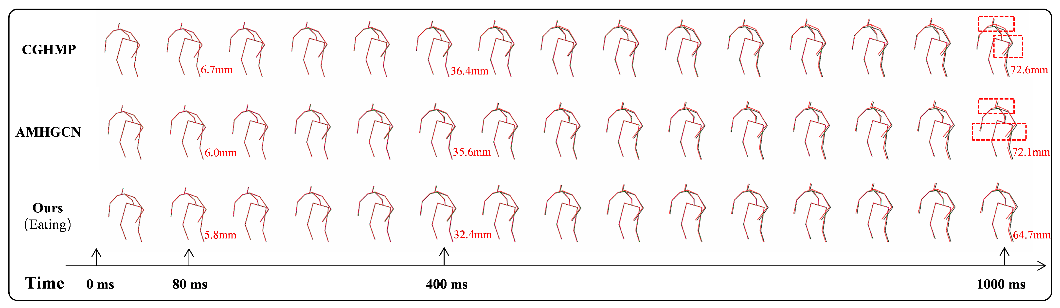 Figure 3 visualizes the predictions for the ‘Eating’ sequence, with ground truth in magenta and predictions in blue–green, and it is annotated with MPJPE values at 80 ms, 400 ms, and 1000 ms. Red dashed rectangles highlight the significant errors. While the baselines performed well in the short term, their predictions drifted over time. In contrast, our method maintained high accuracy throughout, demonstrating superior long-term stability—consistent with the quantitative results.