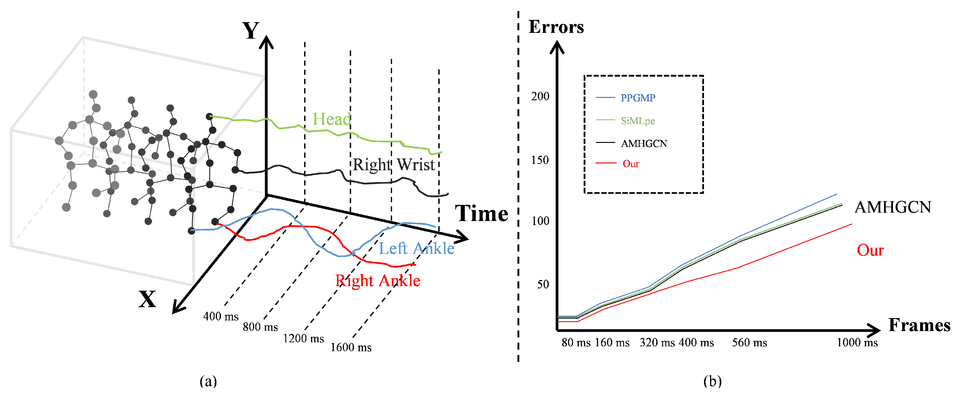 Table 3, our model reduces MPJPE by 23.1% (periodic) and 12.6% (non-periodic) at 1000 ms compared to AMHGCN. This highlights its robustness not only in regular motions, but also in complex, irregular behaviors, indicating strong generalization across diverse temporal and structural patterns.