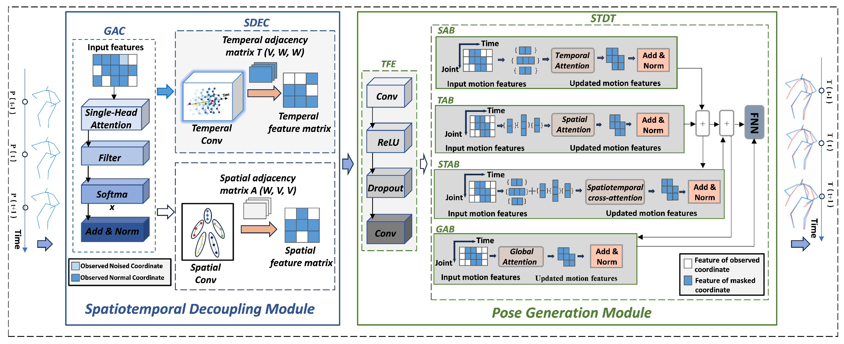 Section 3.2). Specifically, the input pose sequence is first processed by the spatiotemporal decoupling encoding module, which separates spatial and temporal features to more effectively capture the relationships across different dimensions. Subsequently, within the pose generation module, the
