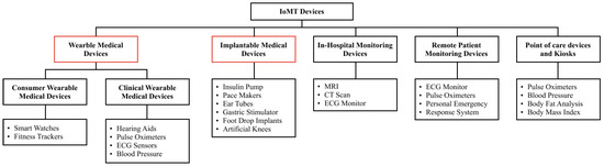 Figure 1 shows IoMT device classification. The IoT interconnects distinct physical entities, enabling embedded sensors and software to exchange data with edge and cloud platforms. Extending these principles into the clinical domain, the IoMT operates within care workflows to enable real-time monitoring, remote patient management, and early detection of anomalies, thereby improving patient outcomes through continuous monitoring, personalized treatment, and telemedicine [6,7]. The IoMT encompasses patient-worn devices (e.g., smartwatches, biosensor patches), hospital-deployed assets (e.g., smart beds, infusion pumps), and implantable systems that stream remote telemetry or deliver closed-loop therapies (e.g., pacemakers, neurostimulators) [8]. The IoMT sector continues to expand as companies consistently release specialized sensors and advanced monitoring tools. Unlike the general-purpose IoT, the IoMT handles sensitive health data, making robust security essential.