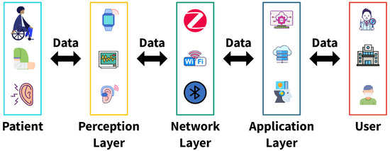 Although IoWDs are noninvasive, they present challenges, most notably in measurement accuracy, which varies depending on wearing conditions and device-specific characteristics. Furthermore, security threats such as data leakage and tampering, which can directly impact patient safety, must also be addressed. In this context, IoMT systems continuously generate vast amounts of patient-specific clinical data. To manage the complexity of IoMT systems, a layered architecture has been adopted. While various architectures exist, their components can be categorized into three core layers: perception, network, and application [28,29].