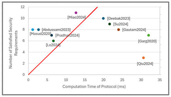 From the graph, it can be observed that protocols positioned closer to the upper left side of the trendline achieve both higher security and greater computational efficiency. A position above and to the left of the trendline suggests that a protocol satisfies a relatively large number of security requirements while maintaining a lower computational burden, thus demonstrating superior performance. According to the graph, the protocol proposed by Miao et al. is especially notable.