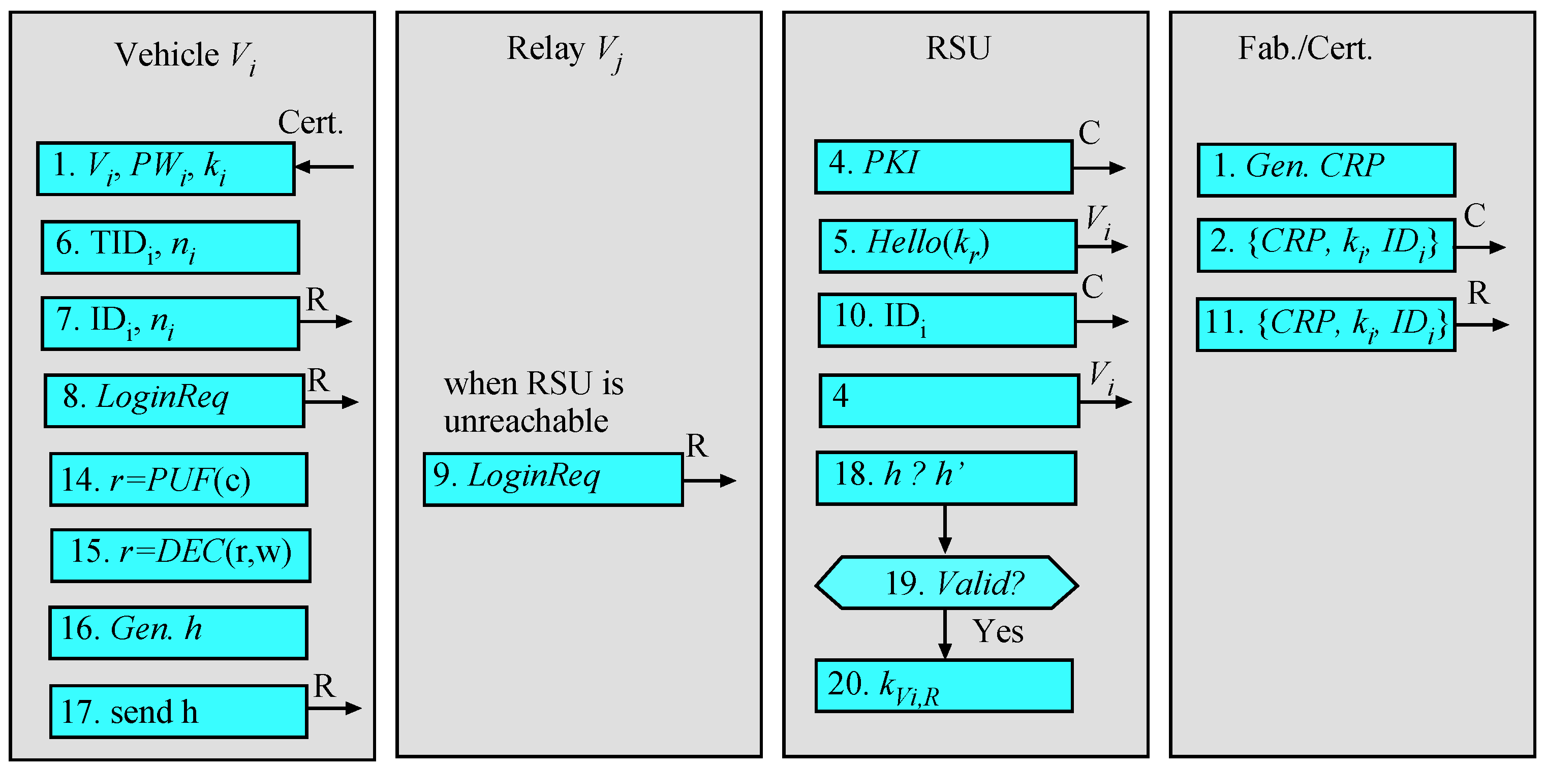 - All trusted vehicles must have a PUF, or an equivalent synthetic set, to facilitate creation of a unique ID, generation of a secret key exchange, and mutual authentication between vehicles and the RSU.