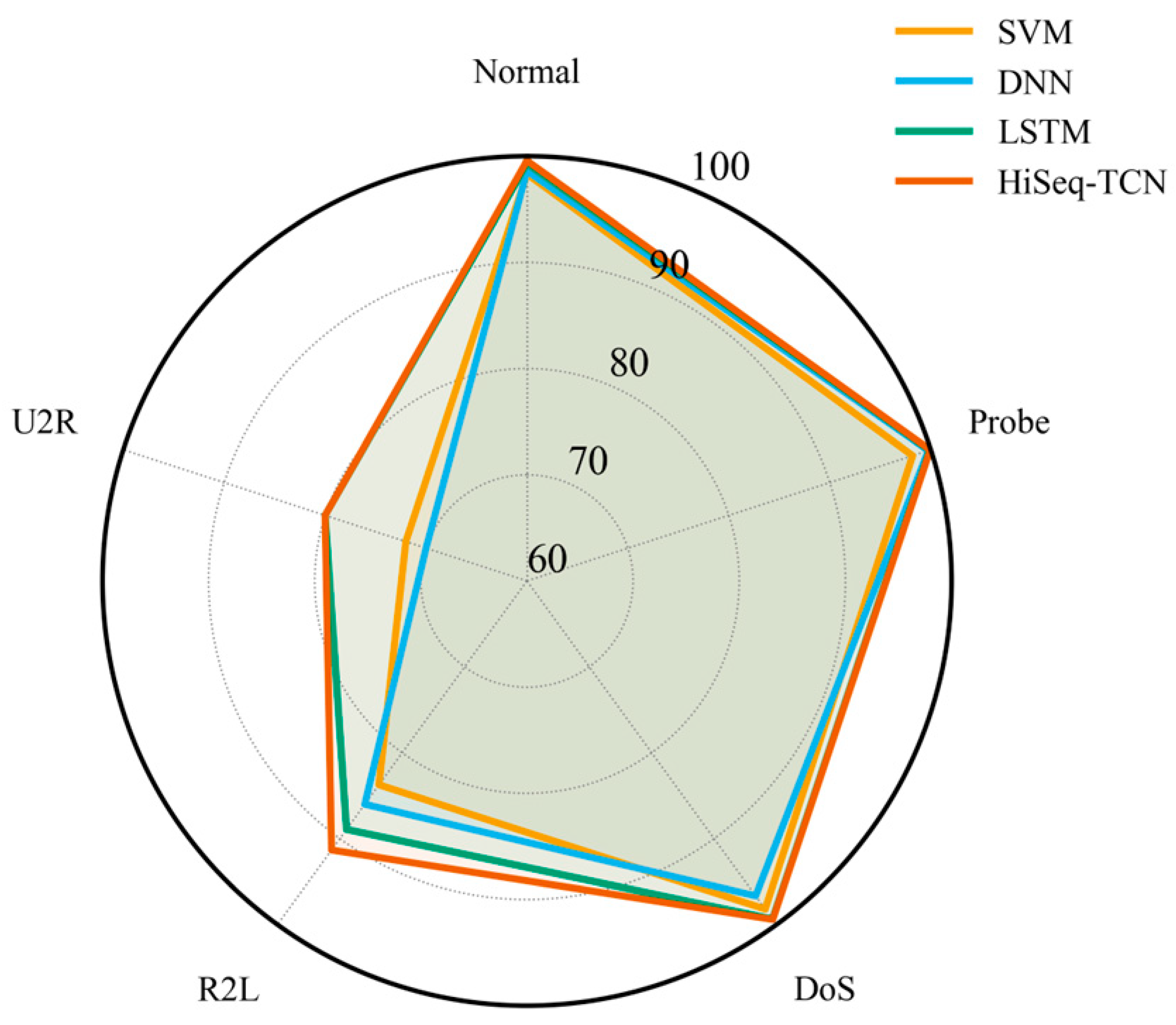 Figure 3, the radar plot confirms that HiSeq-TCN achieved consistently high and balanced performance across all classes. It demonstrated high accuracy for majority classes, including Normal, Probe, and DoS, while substantially improving detection of minority classes, such as R2L and U2R. By effectively narrowing the performance gap between common and rare attacks, HiSeq-TCN exhibits robustness in identifying both frequent and infrequent attack types. This balanced performance is consistent with its overall accuracy of 99.44%, indicating reliable detection across all categories without compromising recognition of rare attacks.