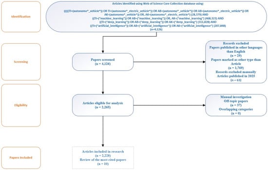 In the screening section, only the papers that are related to all four fields were taken into account, resulting in 4126 articles. At the same time, another set of filters has been applied to the dataset, removing the articles that are not published in English (29 articles), together with the papers that were not marked as “Article” in WoS database (1769 papers) and the documents published in 2025 were also removed (63 papers), resulting a total of 2265 papers. In the eligibility section, a manual investigation of the papers has been accomplished, dropping articles that are not related to the topics investigated, reducing the size of the dataset by 37, to 2228. In the last section, called Papers Included, a total of 2228 articles have been retained in the dataset, while the top 10 most cited papers have been retained for a detailed analysis. To be sure that the process was in accordance with the existing literature, we investigated articles that evaluated similar topics. Morooka et al. [19] explored the DL and AVs topics using a bibliometric analysis. For the extraction process, a PRISMA flow diagram was created where authors included over 6755 documents. Authors excluded papers that were not published in English or between 2017 and 2022, resulting in a total of 59 papers.