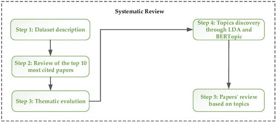 As for systematic review, the steps in Figure 2 have been considered. Also, in step 4, in terms of topic discovery, a LDA [22] and BERTopic [23] analyses have been provided with the purpose of offering a more complete picture on the selected research field.