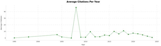 Figure 3 presents the mean citations per year for the analyzed timespan. For the first year when a paper was published, in 1995, there is an average of 0.3 citations, followed by a positive trend up to 2004, when a mean of 5.1 citations has been achieved. The trend decreased between 2004 and 2007, achieving a minimum value of 0.1.
