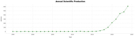 Figure 4 describes the yearly scientific production of authors on the field of AVs, ML, DL and AI. The first paper was published in 1995, followed by three documents in 1998. Between 1998 and 2004, there were no documents published, and in 2004 one document had been published, followed by two in 2005. The trend started to increase in 2017, when 19 articles were published, followed by a positive trend up to 2024, when the peak was achieved, with a total of 612 articles, compared to 475 in 2023, 433 in 2022, 299 in 2021, 212 in 2020, 103 in 2019, and 45 in 2018.