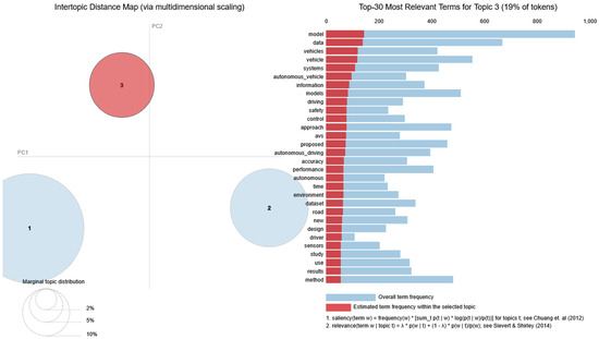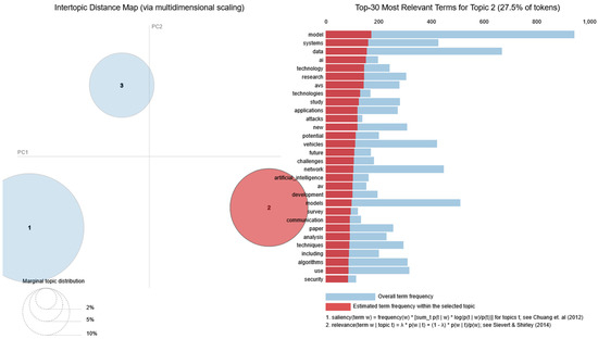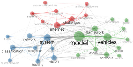Figure 5 reflects the co-occurrence network of the most frequently used 30 keywords plus divided into three groups. The main cluster contains information about the importance of AVs: “performance”, “impact”, “safety”, “behavior”, “design”, “networks”, “models”, “vehicles”, “framework”, “optimization”. The blue cluster includes the prediction and tracking of AVs algorithms: “system”, “vision”, “network”, “neural-networks”, “classification”, “recognition”. The last cluster, represented with red express the challenges of AVs implementation: “internet”, “challenges”, “communication”, “systems”, “architecture”, “management”, “artificial-intelligence”, “autonomous vehicles”.