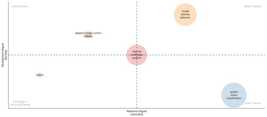 The last two clusters, colored in brown and green are smaller compared to the clusters that have been described, containing information about stability, adaptive cruise control and robustness of the AVs: for the brown cluster there are “adaptive cruise control” (14 occurrences), “stability” (11 occurrences), and for the green cluster there is “robust” (15 occurrences). Both clusters are on the left part of the graph, which means that there is a small centrality, but for the brown cluster there is a high centrality value, while the green group has a reduced centrality. Nevertheless, once more it should be mentioned that this map is built based on Keywords Plus, meaning that it is based on the most used keywords in the titles of the papers included in the dataset that has been cited. Given this observation, it might happen that some of the identified themes do not match perfectly the themes of the papers included in the dataset as these papers have been used by the authors of the papers included in the dataset as a base for their papers and, in some cases, they might have been cited only for establishing a context and not referring necessarily and entirely to the autonomous vehicles field and AI. This being mentioned, the exposed situation might be the cause for the content of the cluster marked in orange and listed in the niche themes quadrant. As a result of this observation, in the following a thematic map made based on the author’s keywords is provided, which better shapes the purpose and the analyses made in the papers included in the dataset by the authors of the works.