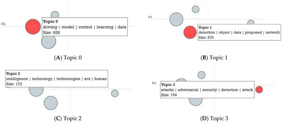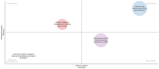 Figure 6 contains the most frequently used 250 Keywords Plus that have been clustered in five groups. In the thematic map axis two metrics are described: centrality and density. Density refers to the level of development by identifying the internal association of terms in different topics, while centrality quantifies the impact of the terms in the thematic map [37]. The main cluster, colored in blue, can be observed in the bottom right part of the thematic map, which means that the cluster has a high centrality and a small density. The keywords included in the cluster are “network” (111 appearances), “system” (70 appearances), “vision” (67 appearances), “classification” (62 appearances), “framework” (58 appearances), “algorithm” (49 appearances), “recognition” (48 appearances), “tracking” (48 appearances), “design” (42 appearances). The second cluster, colored orange, has a high centrality, is a little bit smaller compared with the blue cluster, but it has a high-density value. The focus of the group is on AVs’ benefits, technologies and impact: “model” (136 occurrences), “vehicles” (79 occurrences), “autonomous vehicles” (49 occurrences), “behavior” (41 occurrences), “safety” (29 occurrences), “artificial-intelligence” (26 occurrences), “impact” (23 occurrences), “time” (20 occurrences). The third cluster, which is in the middle of the map, represented with red, contains information about challenges and risks of the new technologies that are used in AVs: “internet” (60 appearances), “challenges” (52 appearances), “systems” (49), “management” (29 appearances), “communication” (25 appearances), “architecture” (24), “attacks” (22), “intelligence” (19 appearances), “security” (17 appearances), “blockchain” (16 appearances).