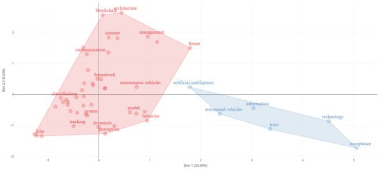 Figure 8 divided the Keywords Plus into two clusters by using factorial analysis. The red cluster is the most representative that contains the behavior, management, tracking, perception or architecture of AVs, DL, ML and AI. The main keywords that have been used in the red cluster are: “management”, “perception”, “behavior”, “tracking”, “classification” or “communication”, while the second group includes the acceptance and trust of the methods: “technology”, “Artificial Intelligence”, “automated vehicles”, “trust”, “acceptance” and “information”.