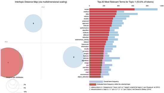 Step 4 deals with topic discovery based on LDA and BERTopic. In terms of topic discovery through LDA, it should be stated that it is a generative probabilistic model used primarily for topic modeling in natural language processing (NLP) and it is usually used for discovering the hidden (also known as “latent”) topics within a given corpus [22,24]. As for the BERTopic, the tool extracts a coherent topic representation through the development of a class-based variation of TF-IDF, providing competitive results when compared to a series of benchmarks in topic modelling [23]. To enhance the topic detection accuracy, the textual data has been preprocessed first by converting the text to lowercase and removing punctuation. Since LDA treats tokens such as “AI” and “Artificial Intelligence” as separate entities, term normalization has also been performed to provide a unified representation for semantically equivalent expressions. Additionally, domain-specific stop words, such as the ones used as filters during the paper selection process, have also been removed. For the LDA model a grid search approach has been applied for choosing the best values for the alpha and eta parameters, with the aim of balancing a relatively low number of topics and a high coherence score. In the case of BERTopic, the minimum size of the clusters and the minimum samples parameter of the HDBSCAN algorithm have been iteratively adjusted to achieve a similar balance between granularity and interpretability. The LDA implementation used in this study is the one provided by the Gensim Python 3.12 library [26].