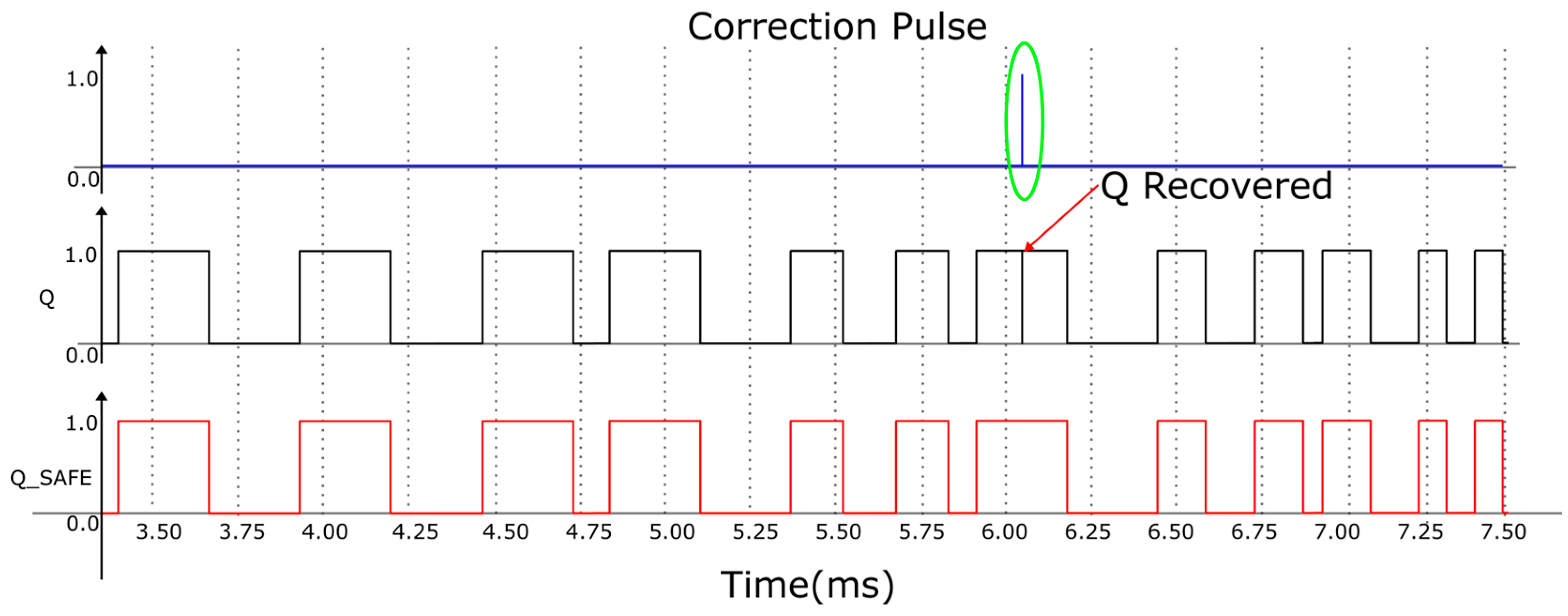 Figure 12. Example simulation of SEU recovery under SET injection at the main D_FF output: (top) Correction pulse, (middle) corrupted D_FF output showing correction, (bottom) Safe copy of the output bit. The corrected code is available within the same conversion period.