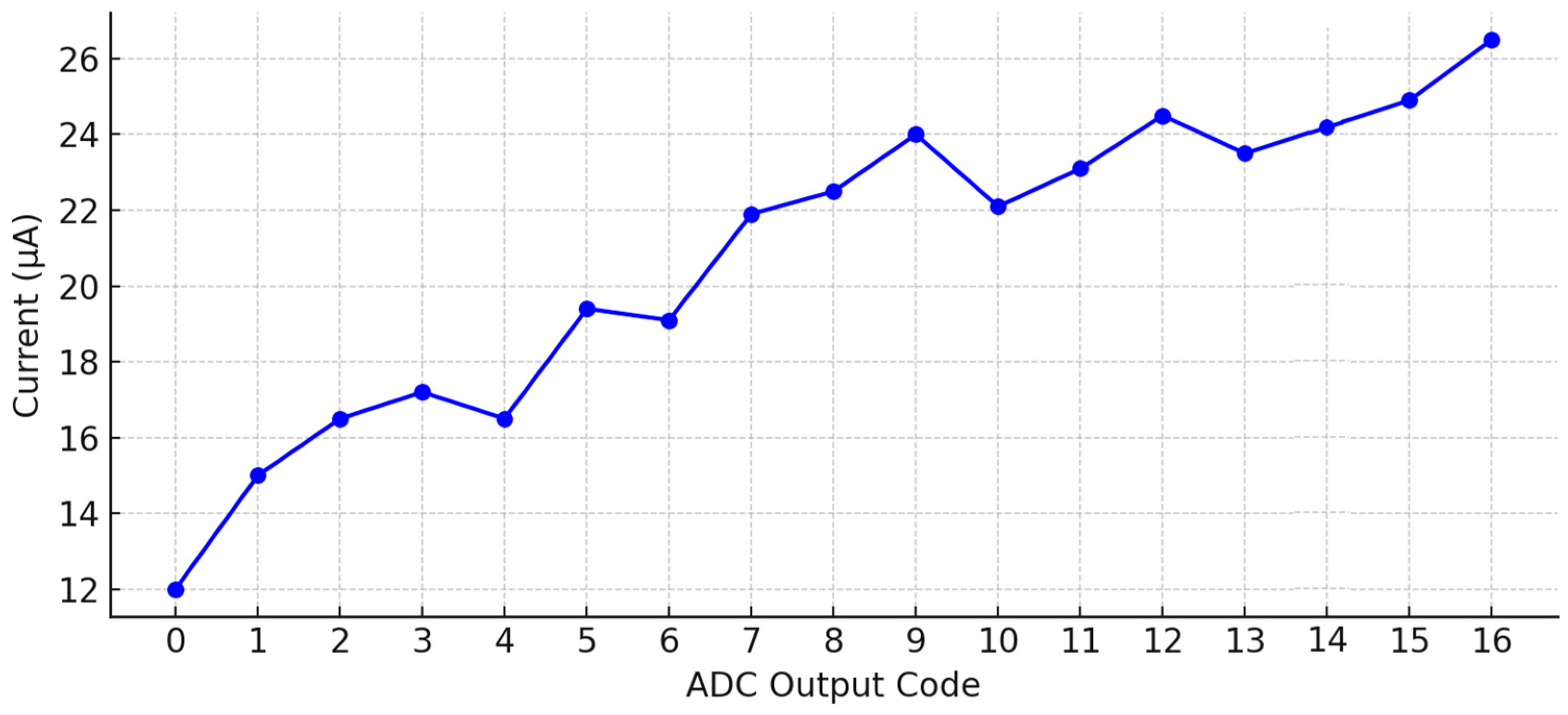 The static and dynamic current consumption of the ADC was measured across all output codes to evaluate power requirements under nominal conditions. A 1.0 V supply was used for all measurements. The results, shown in Figure 13, indicate that the supply current varies with output code due to switching in the comparator array, encoder, and error-correction logic. The measured current consumption ranges from approximately 12 µA at code 0000 to 26.5 µA at the maximum code. This variation reflects the sequential comparator enable scheme, where higher codes activate more comparators, resulting in higher dynamic current. At 1.0 V, the corresponding power consumption ranges from 12 µW to 26.5 µW.