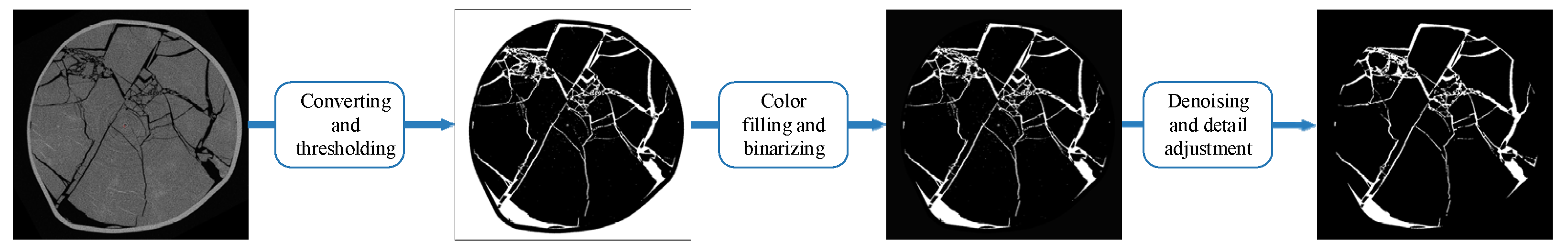 The process of coal-crack segmentation from CT images can be divided into three parts, as illustrated in
