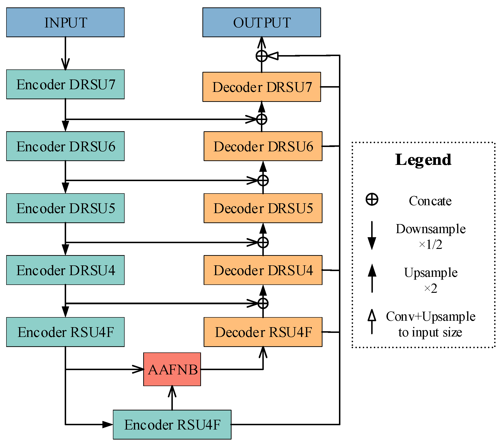 2-Net. This module aims to enhance the feature extraction and fusion capabilities of the original module. The DRSU comprises two serially connected RSU modules with skip connections added between them. The SOD model was modified into a segmentation model to generate binary predictions. To incorporate global information into feature maps, a new block termed Atrous Asymmetric Fusion Non-Local Block (AAFNB) is introduced. This block enhances the sampling method of ANN via atrous convolution and introduces a novel multi-scale fusion attention structure. The AAFNB block is placed between the encoder and decoder, where it fuses the global information of high-level feature maps.