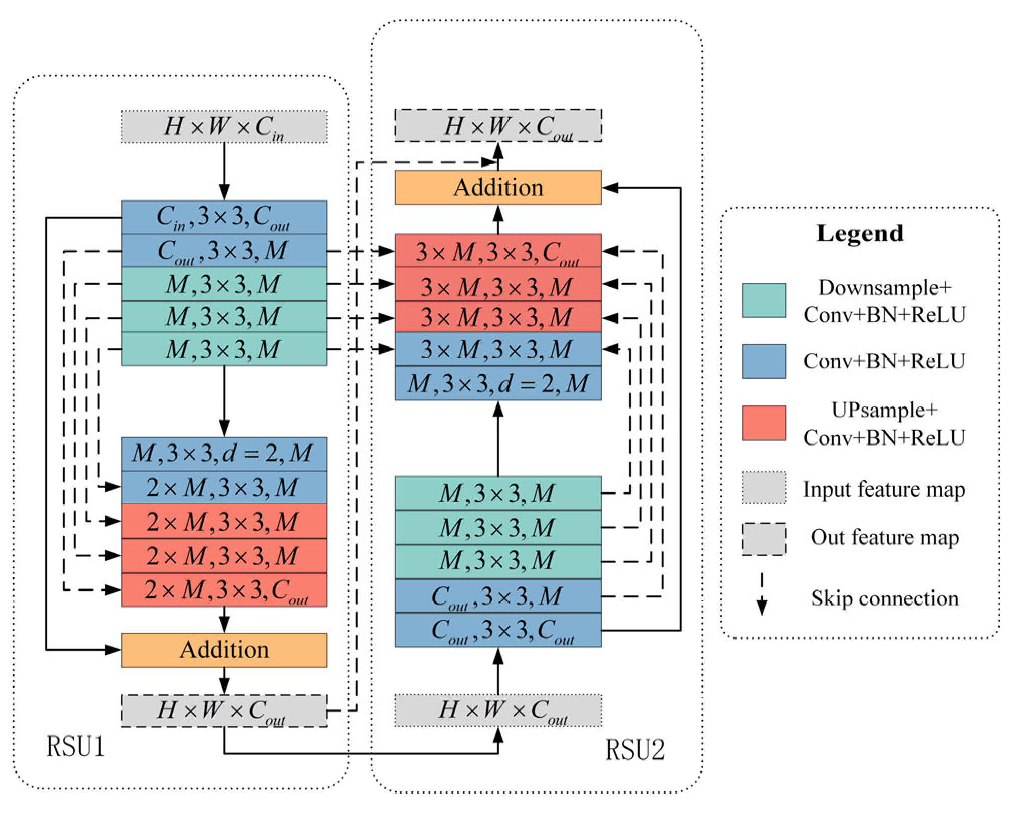Figure 4. The encoder part of each RSU includes 5 convolution layers, as does the decoder part. Similarly, each part in RSU7 has 7 such convolutional layers.