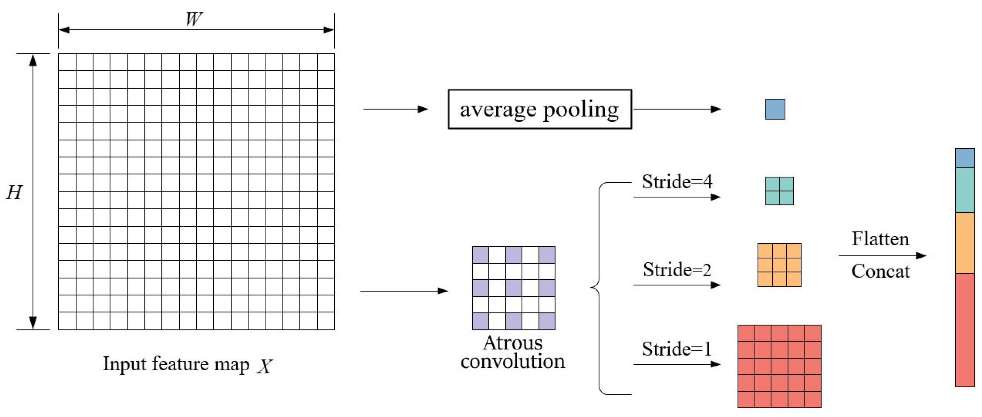 In the sampling structure, both atrous convolution and global average pooling are applied. Three 3 × 3 and dilation = 2 atrous convolutions with different strides are used to short-range feature extract and global sample in