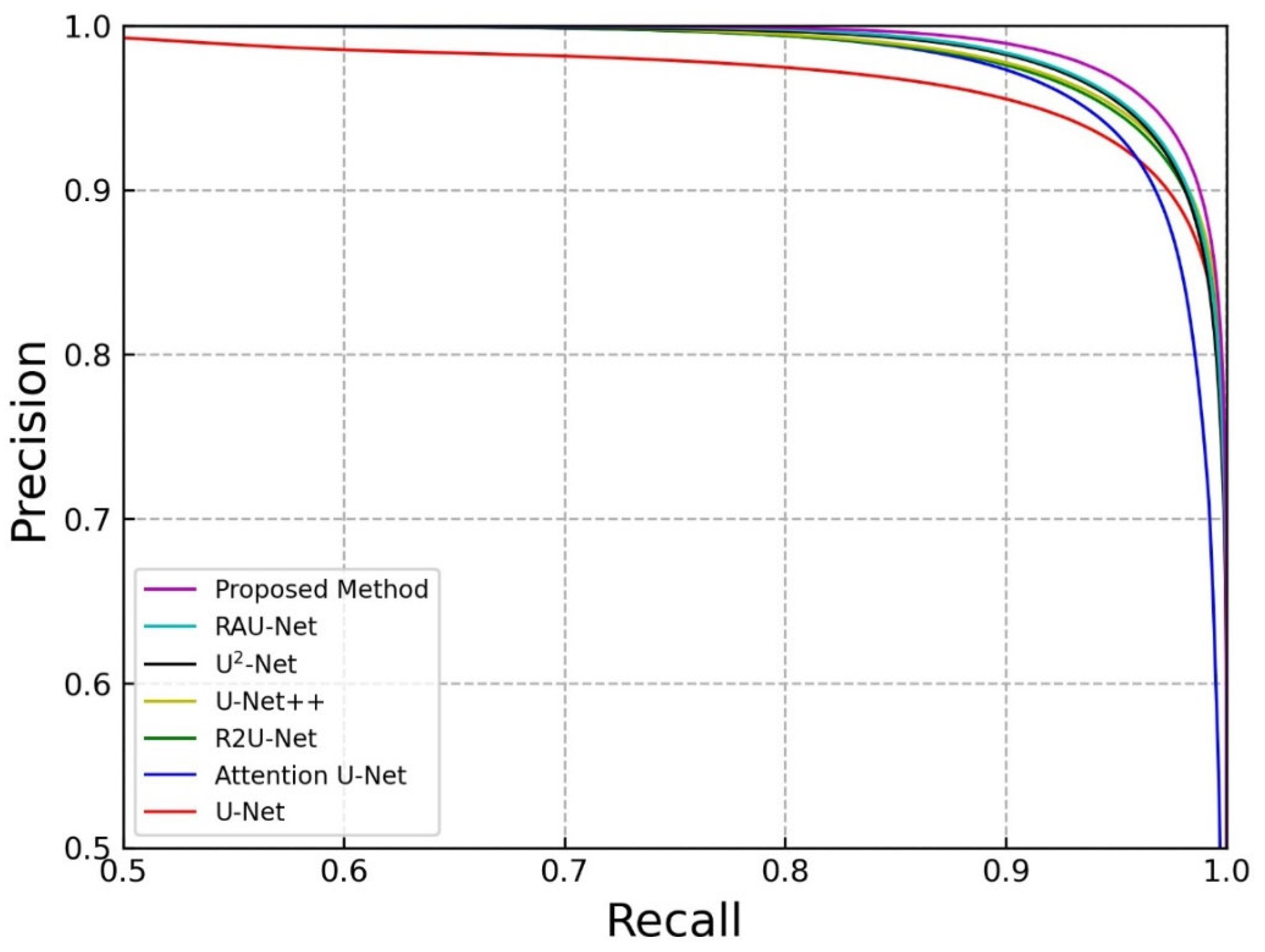 Several high-performance U-Net series models are compared with the proposed method: U-Net, Attention U-Net, Recurrent Residual U-Net (R2U-Net), U-Net++, and Residual Attention U-Net (RAU-Net).