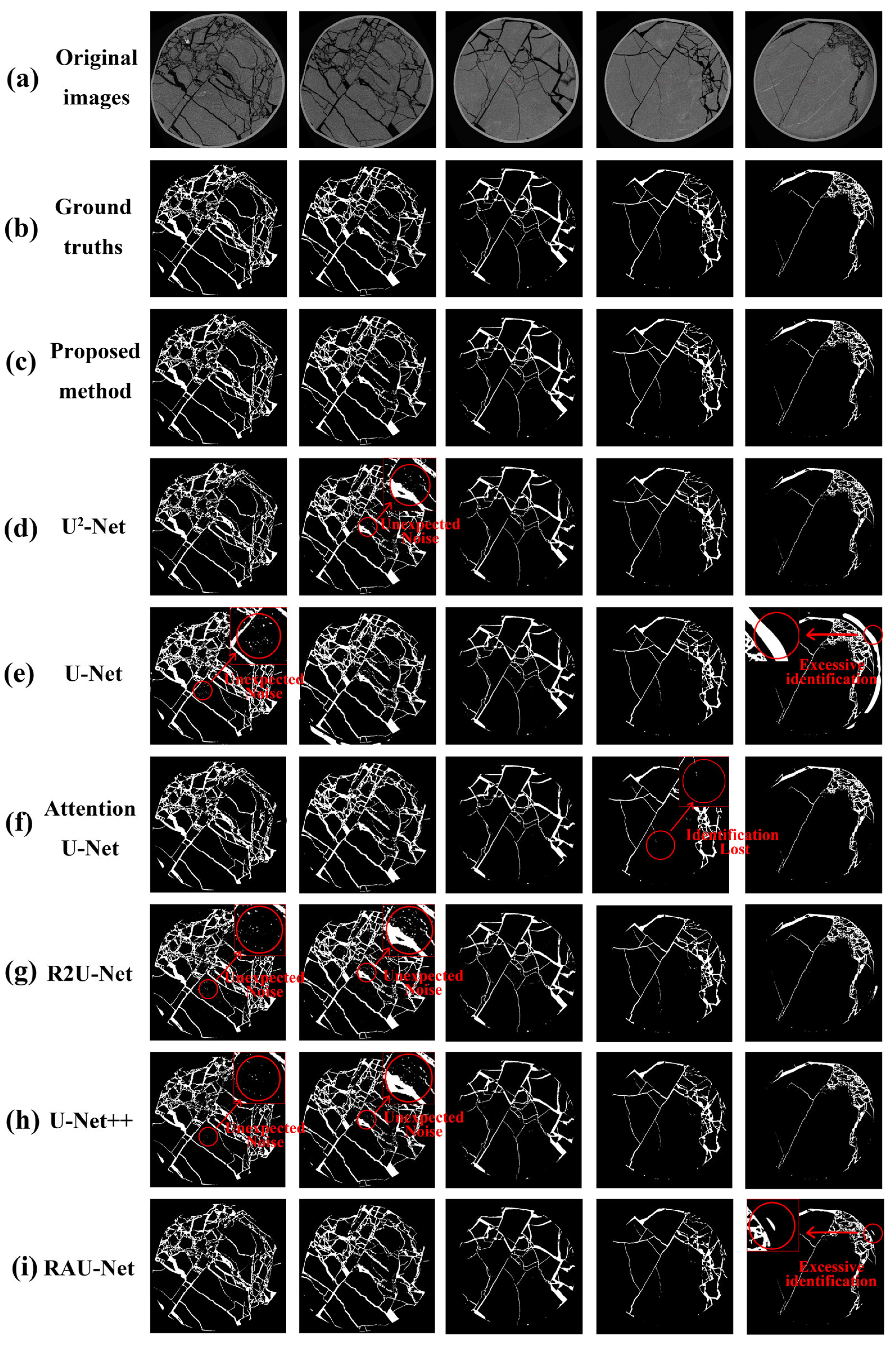 Figure 8 shows several segmentation samples predicted by all these methods. The red circles highlight differences between the proposed method and the others. Firstly, the proposed method effectively avoids some noises caused by misidentified coal matrices. This phenomenon regularly appears in the result maps of complex structures, such as the results of U